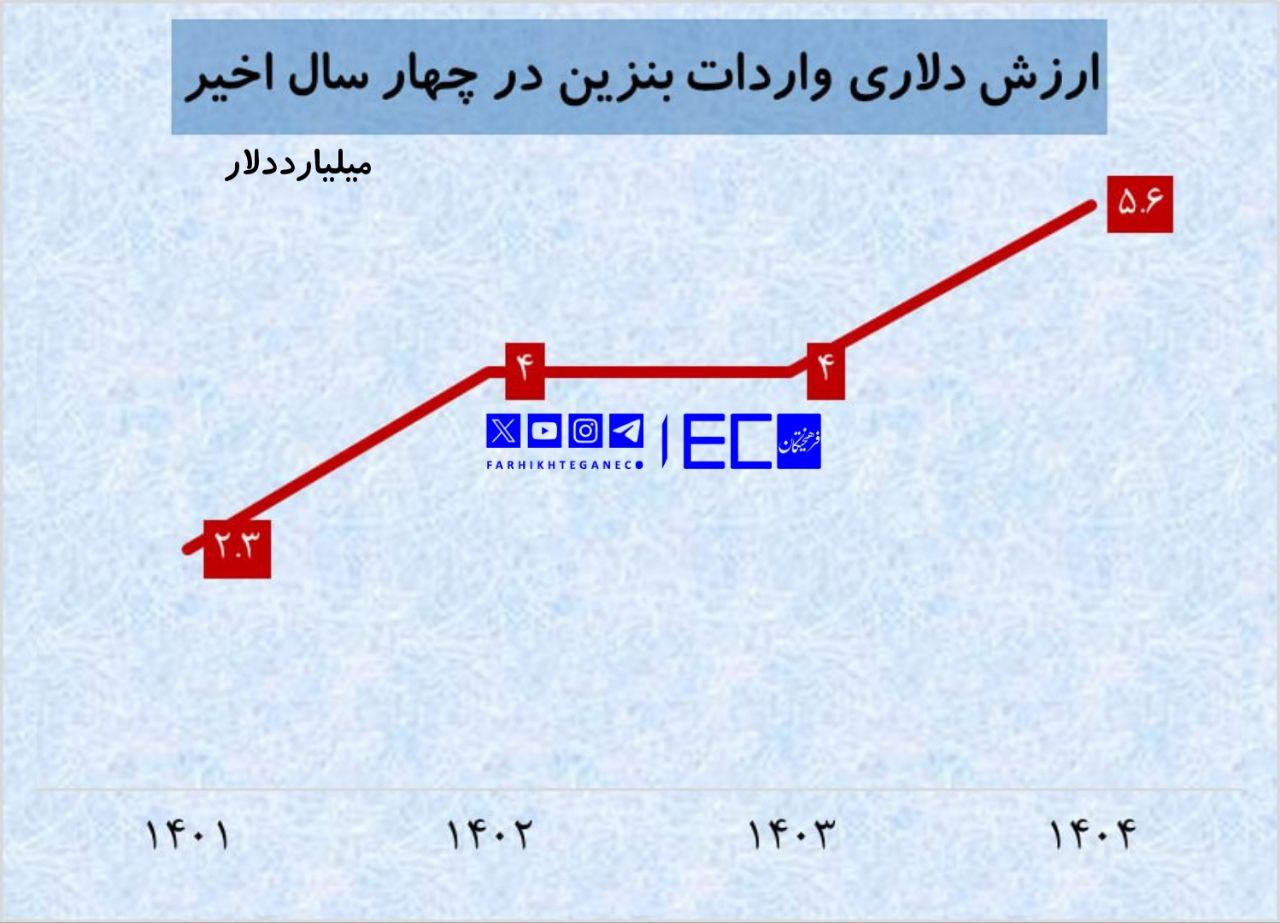 رکورد ۲.۵ برابری واردات در ۴سالواردات بنزین که در سال ۱۴۰۰ به صفر رسیده بود، امروز به ۱۱ تا ۲۰ میلیون لیتر در روز رسیده و هزینه آن از ۲.۳ میلیارد دلار در سال ۱۴۰۱ با یک جهش ۲.۵ برابری به ۵.۶ میلیارد دلار رسیدهاست.
