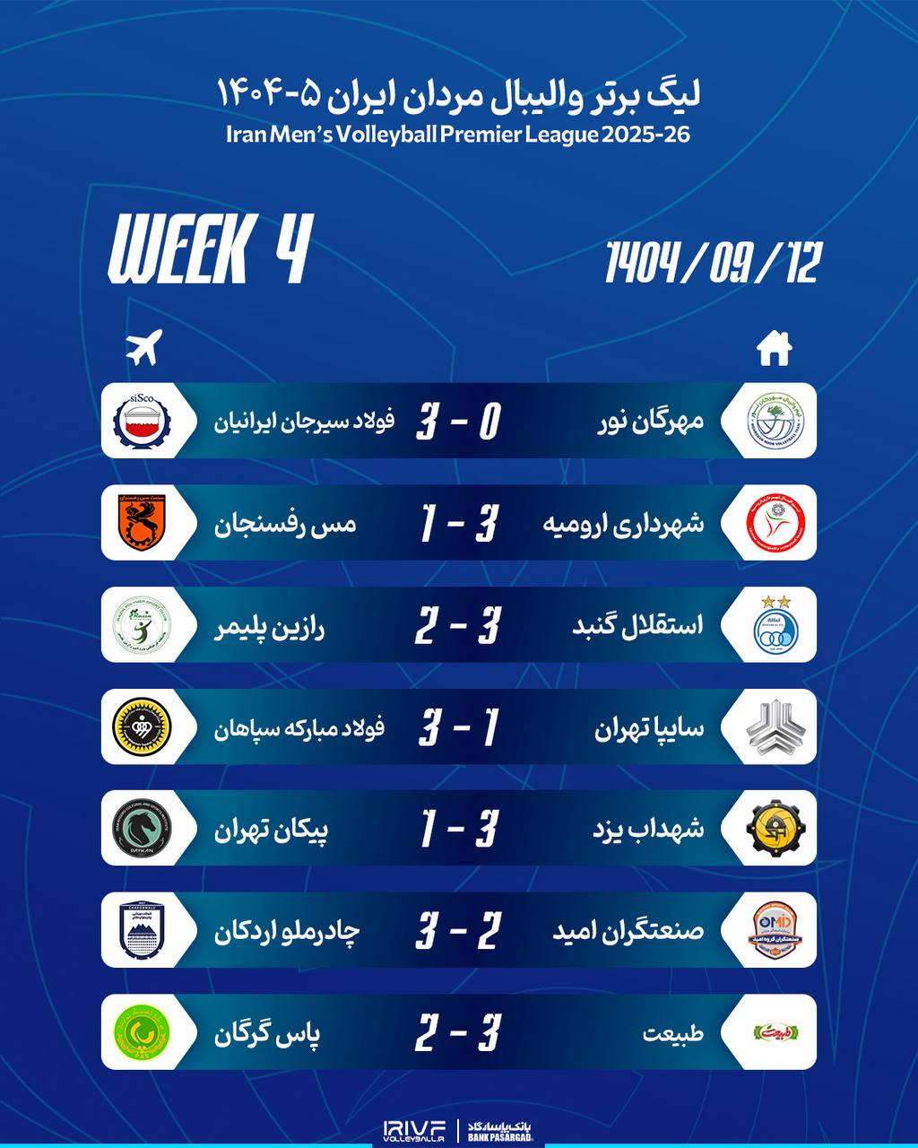 فرهیختگان: هفته چهارم دور رفت مرحله مقدماتی مسابقات والیبال قهرمانی باشگاه‌های برتر مردان ایران امروز چهارشنبه ۱۲ آذرماه با هفت دیدار آغاز شد و تیم‌های فولاد سیرجان، شهرداری ارومیه، سپاهان، شهداب یزد، چادرملو، استقلال گنبد و طبیعت این هفته را با برد به اتمام رساندند.