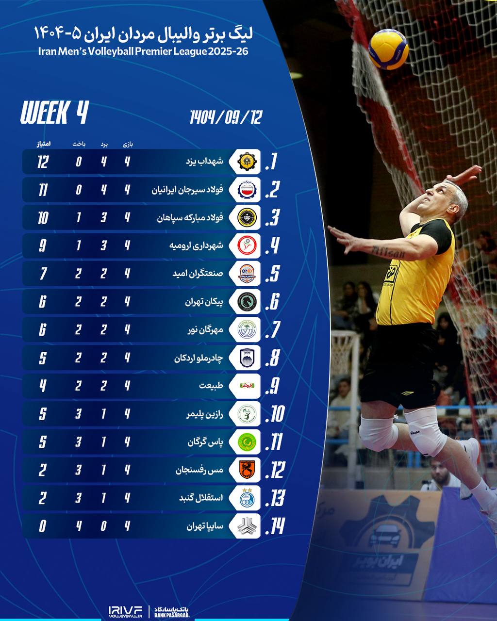 در پایان هفته چهارم لیگ والیبال جایگاه نخست تا هفتم نسبت به هفته گذشته دستخوش تغییر نشد و تیم‌هایی شهداب یزد، فولاد سیرجان، سپاهان، شهرداری ارومیه، صنعتگران امید،  پیکان و مهرگان نور با قرار داشتن در نیمه بالای جدول امیدوار به درخشش در هفته پنجم هستند.