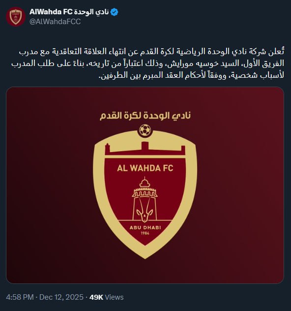 در اطلاعیه باشگاه الوحده آمده: «شرکت باشگاه ورزشی فوتبال الوحده اعلام می‌کند که قرارداد همکاری با سرمربی تیم فوتبال بزرگسالان، ژوزه مورایس، از تاریخ امروز به پایان رسیده است. این تصمیم بنا به درخواست خودِ سرمربی و به دلایل شخصی اتخاذ شده و مطابق با مفاد قرارداد منعقدشده میان دو طرف صورت گرفته است.»