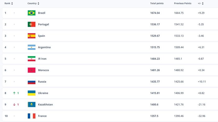 از سوی دیگر در بخش مردان، جایگاه تیم فوتسال کشورمان که ماه گذشته در بازی‌های کشورهای اسلامی به مقام قهرمانی رسید، در رنکینگ فیفا تغییری نکرده است. تیم ملی فوتسال مردان ایران در رده پنجم جهان و رده اول آسیا قرار دارد. در رنکینگ برترین‌های فوتسال جهان در بخش مردان، تیم‌ برزیل در صدر قرار دارد و تیم‌های پرتغال، اسپانیا و آرژانتین در رده‌های دوم تا چهارم هستند.