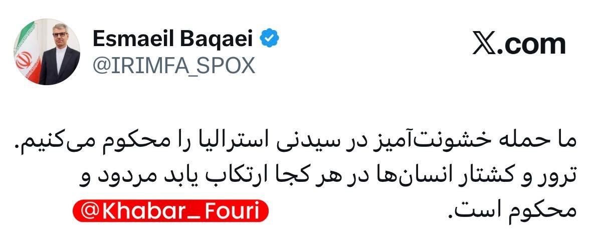 اسماعیل بقایی سخنگوی وزارت خارجه در توئیتی حمله سیدنی استرالیا را محکوم کرد.