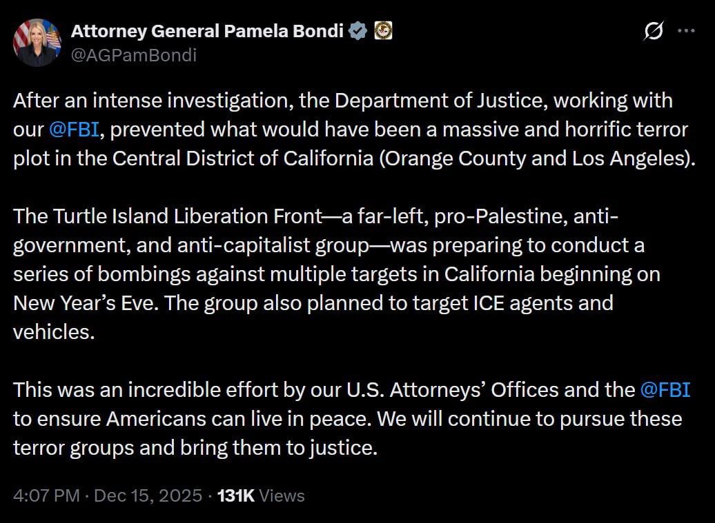 پم باندی در پیامی در شبکه اجتماعی ایکس نوشت: پس از تحقیقات فشرده، وزارت دادگستری آمریکا با همکاری افبیآی توانست از وقوع یک توطئه تروریستی بسیار گسترده و هولناک در نواحی لسآنجلس و اورنج کانتی جلوگیری کند.