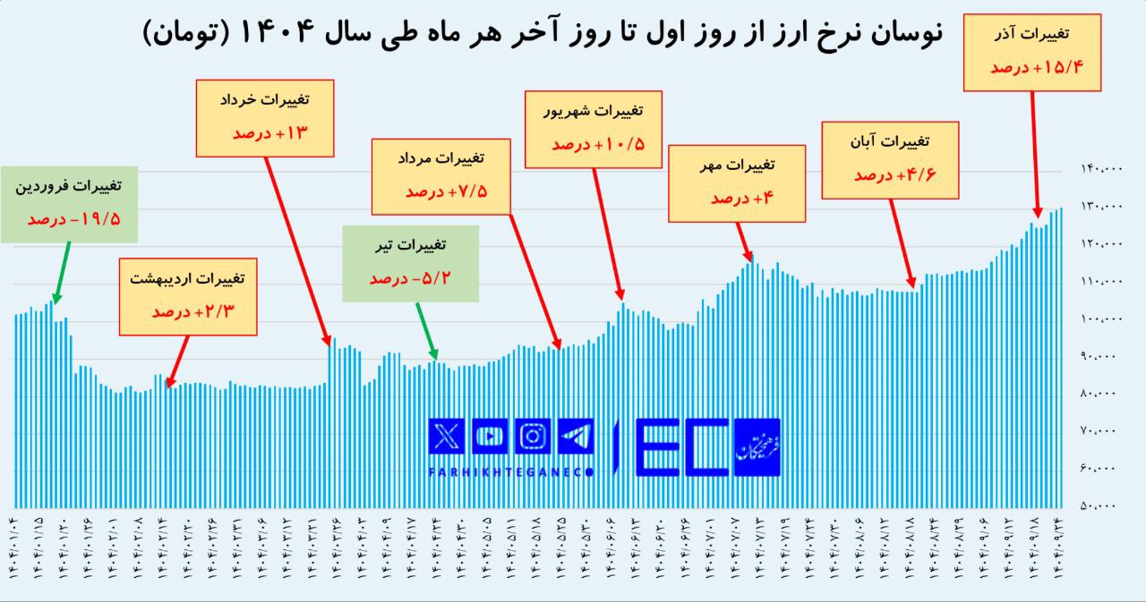 قیمت دلار در بازار آزاد از ۱۰۸ هزار تومان در پایان مهرماه به محدوده ۱۳۰ هزار تومان رسیده که رشد حدود ۲۰ درصد را نشان میدهد. کارشناسان عوامل مختلفی را در این نوسانات افزایشی دخیل میدانند که از جمله آنها میتوان به ناآرامیهای سیاسی و منطقهای، انتظارات تورمی، کاهش ورود ارز صادراتی ناشی از تحریمها و سهنرخی شدن قیمت بنزین اشاره کرد.