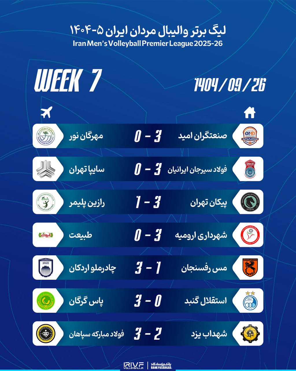 فرهیختگان: هفته هفتم مسابقات والیبال قهرمانی باشگاههای مردان ایران با هفت دیدار در شهرهای سیرجان، تهران (دو مسابقه)، ارومیه، رفسنجان، گنبد و یزد پیگیری شد و تیمهای صنعتگران امید، فولاد سیرجان ایرانیان، پیکان تهران، شهرداری ارومیه، چادر ملو اردکان، پاس گرگان و فولاد مبارکه سپاهان در هفته هفتم لیگ برتر مردان موفق به شکست حریفان خود شدند