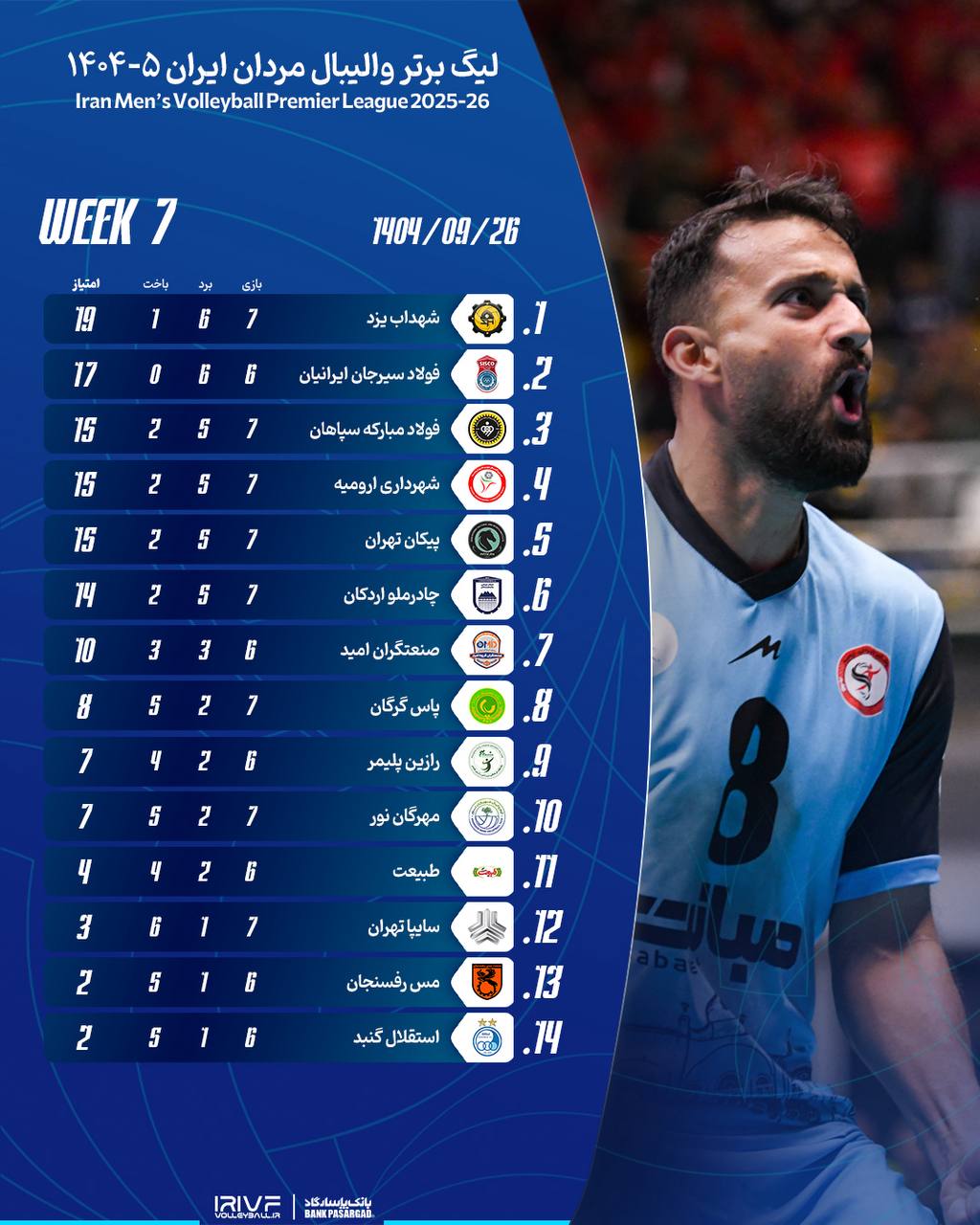 تبدیل شدن فولاد سیرجان به تنها تیم بدون شکست و باختهای تکراری استقلالهفته هفتم لیگ برتر والیبال مردان ایران امروز (چهارشنبه ۲۶ آذر) با هفت دیدار پیگیری شد و شهداب یزد اولین شکست فصل خود را خورد اما به لطف یک بازی بیشتر صدرنشین ماند.
