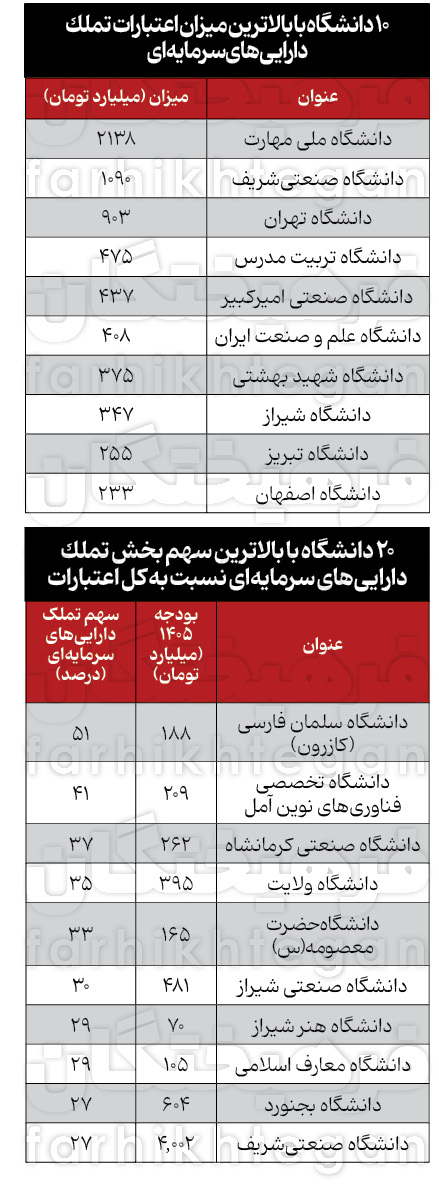 در نگاهی دیگر میتوان وضعیت دانشگاههای ذیل وزارت علوم را از حیث سهم اعتبارات تملک داراییهای سرمایهای بررسی کرد. جایی که معمولا نام دانشگاههای جدیدالتأسیس بیشتر به چشم میخورد. از حیث اعداد و ارقام جداول بودجهای لایحه 1405 بیشترین نسبت هزینهکرد تملک دارایی سرمایهای به دانشگاه سلمان فارسی کازرون اختصاص دارد که حدود نیمی از بودجه 188 میلیاردی خود را صرفاً برای ساختوساز و فعالیتهای عمرانی استفاده خواهد کرد. پس از آن دانشگاه تخصصی فناوریهای نوین آمل قرار دارد که 41 درصد از بودجه 209 میلیاردی را در این زمینه هزینه میکند. دانشگاه صنعتی کرمانشاه سومین دانشگاه محسوب میشود که 37 درصد کل بودجه 262 میلیاردی را به این حوزه اختصاص خواهد داد.