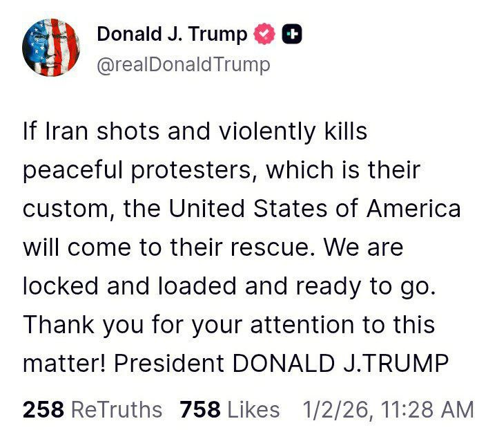 دونالد ترامپ رئیسجمهور آمرکیا در جدیدترین اظهارنطر ضدایرانی خود با ادبیاتی مداخلهجویانه و در شبکه اجتماعی تروث سوشال نوشت: اگر ایران به معترضان مسالمتجو شلیک کند و آنها را بهطور خشونتآمیز بکشد، کاری که معمولاً انجام میدهند، ایالات متحده به کمکشان خواهد آمد. ما آمادهایم.