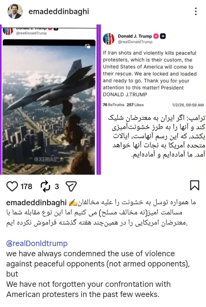 علی لاریجانی، دبیر شورای عالی امنیت ملی جمهوری اسلامی، در شبکه اجتماعی ایکس نوشت: «ترامپ بداند دخالت آمریکا در این مساله داخلی برابر است با بههمریختگی کل منطقه و هدم منافع آمریکا. مردم آمریکا بدانند ماجراجویی را ترامپ شروع کرد. مراقب سربازان خود باشند.با موضعگیری مقامات اسرائیلی و ترامپ، پشت صحنه ماجرا روشن شد.ما مواضع کسبه معترض را از عوامل تخریبگر جدا میدانیم.»