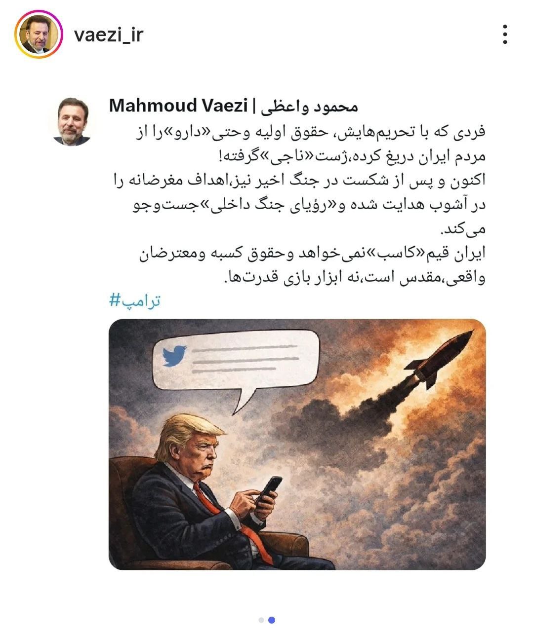 واکنش محمود واعظی، رئیس دفتر دولت حسن روحانی به تهدید ترامپ
