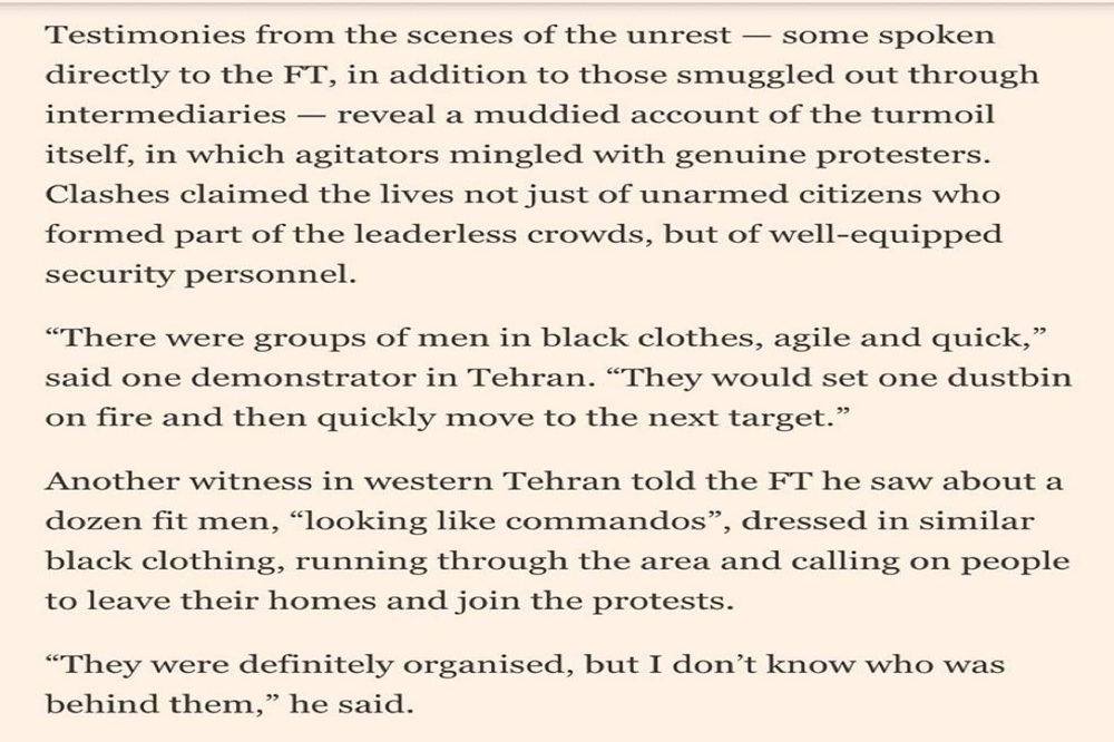 ۲.فاینشنالتایمز گزارش داد که کماندوهای آموزشدیده در تجمعات تهران، اقدامات تروریستی میکردند: