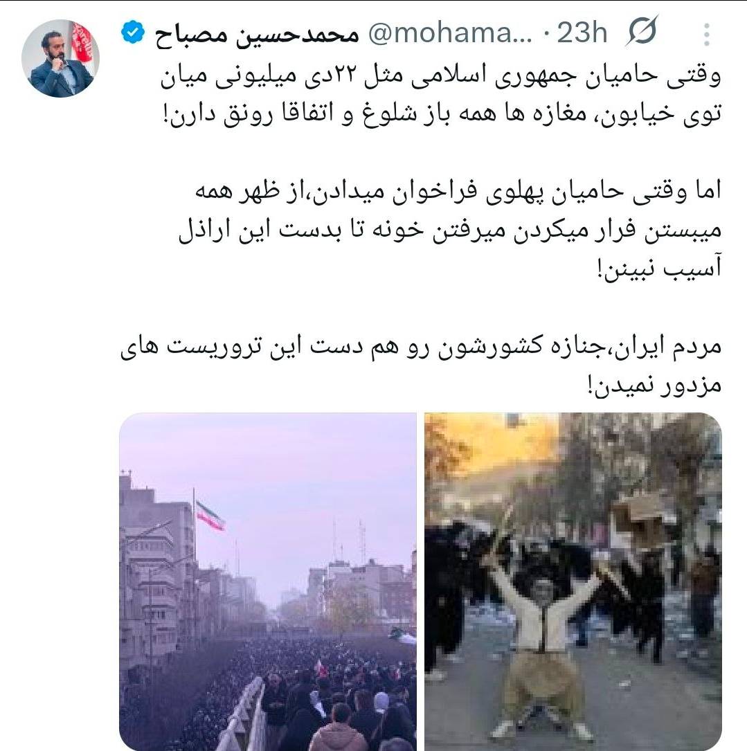 یک تفاوت ساده میان فراخوان جمهوری اسلامی و پهلویمحمدحسین مصباح نوشت: تجمعات حامیان جمهوری اسلامی در روزهایی مثل ۲۲دی میلیونی است و مغازهها باز هستند در حالی که وقتی حامیان پهلوی فراخوان میدادند از ظهر همه میبستند فرار میکردند