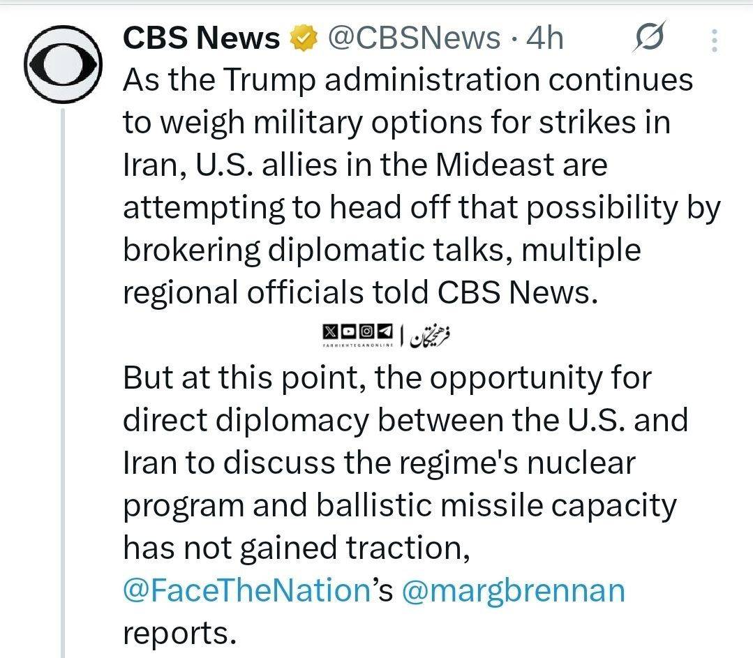 شبکه CBS News آمریکا ادعا کرد: چندین مقام منطقهای به سیبیاس نیوز گفتند، در حالی که دولت ترامپ همچنان گزینههای نظامی برای حمله به ایران را بررسی میکند، متحدان ایالات متحده در خاورمیانه در تلاشند تا با میانجیگری در مذاکرات دیپلماتیک، این احتمال را از بین ببرند. اما در حال حاضر، به گزارش مارگبرنان ، فرصت دیپلماسی مستقیم بین ایالات متحده و ایران برای بحث در مورد برنامه هستهای و ظرفیت موشکهای بالستیک، به نتیجه نرسیده است.