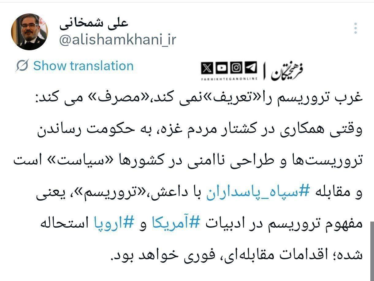 علی شمخانی در حساب کاربری خود در شبکه اجتماعی ایکس نوشت:«غرب تروریسم را«تعریف» نمی کند، «مصرف» می کند: وقتی همکاری در کشتار مردم غزه، به حکومت رساندن تروریستها و طراحی ناامنی در کشورها «سیاست» است و مقابله سپاه پاسداران با داعش، «تروریسم»، یعنی مفهوم تروریسم در ادبیات آمریکا و اروپا استحاله شده؛ اقدامات مقابلهای، فوری خواهد بود.»