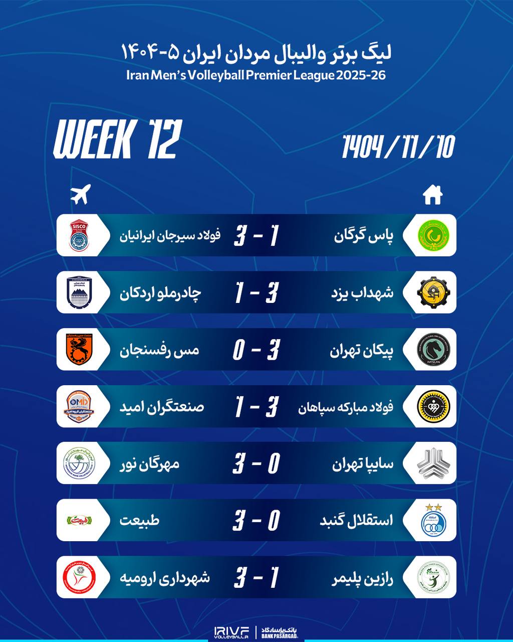 هفته دوازدهم لیگ برتر والیبال مردان از ساعت ۱۱ امروز با تقابل پاس گرگان و فولاد سیرجان ایرانیان در سالن زندهیاد یزدانی خرم تهران آغاز شد؛ دیداری که برای فولادِ مدعی اهمیت زیادی در مسیر تثبیت جایگاهش داشت و پاس نیز به دنبال متوقف کردن یکی از مدعیان اصلی جدول بود این بازی در نهایت با پیروزی سه بر یک تیم فولاد سیرجان پایان یافت. در این مسابقه فولاد سیرجان ستهای اول، سوم و چهارم را به ترتیب با امتیازهای ۲۵ بر ۲۳، ۲۵ بر ۱۷ و ۲۵ بر ۱۶ به سود خود به پایان رساند و پاس گرگان تنها در ست دوم با نتیجه ۲۶ بر ۲۴ به برتری رسید. شاگردان بهروز عطایی با کسب این برد، ۳۱ امتیازی شدند و برای ساعاتی به صدر جدول بازگشتند.