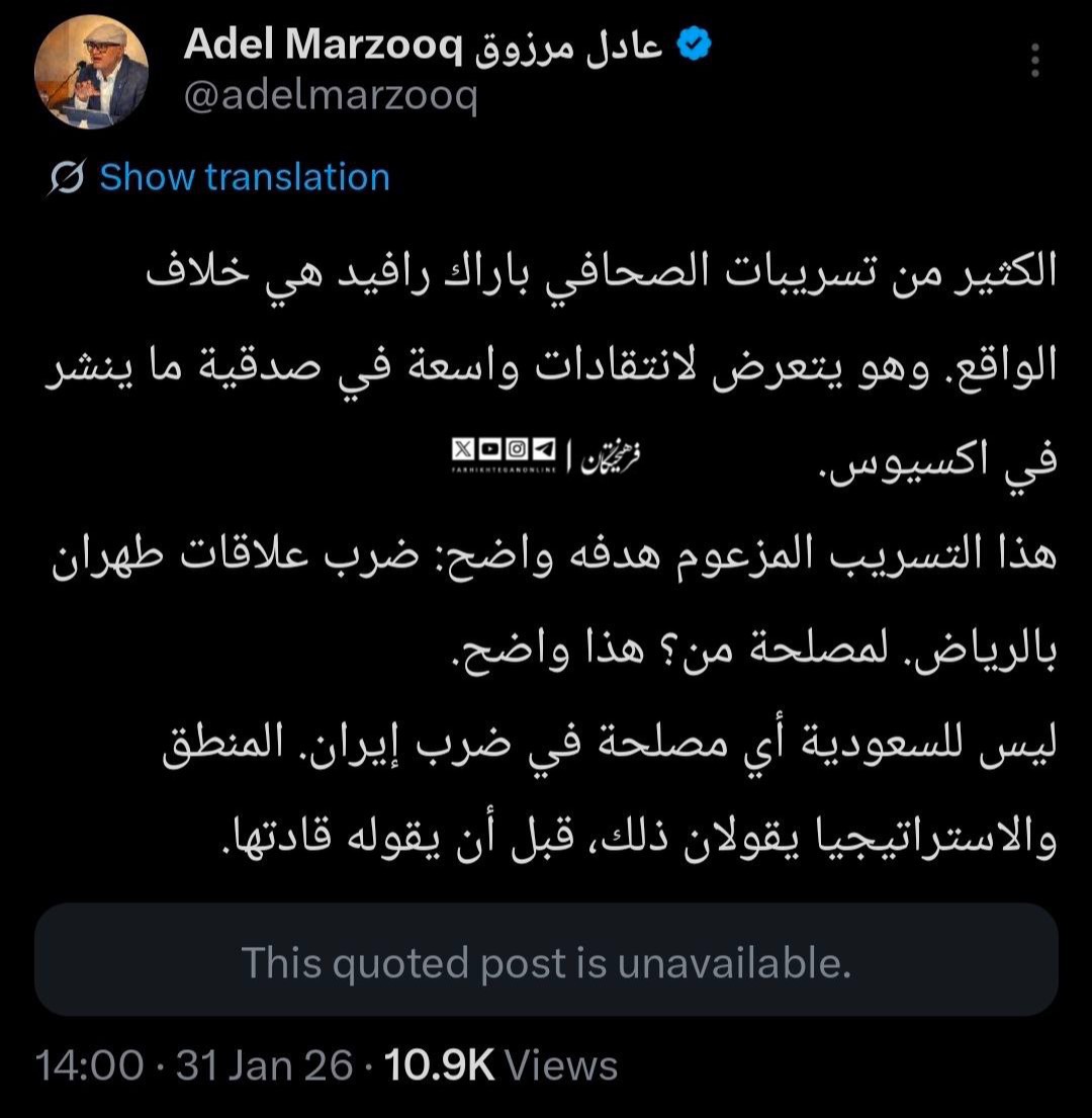 عادل مرزوق، روزنامهنگار بحرینی و مدیر پیشین تلویزیون العربی قطر، در واکنش به خبرسازی صبح امروز خبرنگار صهیونیست درباره سفر وزیر دفاع عربستان سعودی به آمریکا نوشت: بسیاری از افشاگریهای خبرنگار اکسیوس با واقعیت مطابقت ندارد.