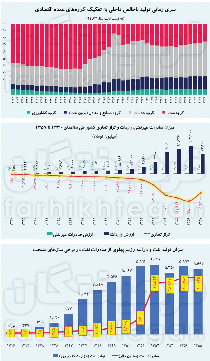 گزارش «فرهیختگان» از فجایع یک راهبرد غلط اقتصادیاز «دهه طلایی» تا «سراب توسعه»؛ ایرانِ ۱۳۲۰ تا ۱۳۵۷ روی دریایی از نفت ایستاد، اما به ساحل توسعه نرسید. رشدهای دورقمی دهه ۴۰ با دوپینگ نفتی اوج گرفت، اما صنعتی که ۲ درصد اقتصاد بود، نمیتوانست موتور ۱۱ درصد رشد باشد. شوک نفتی ۱۳۵۲، واردات را ۲۴ برابر صادرات غیرنفتی کرد و اقتصاد را به بیماری هلندی مبتلا کرد.