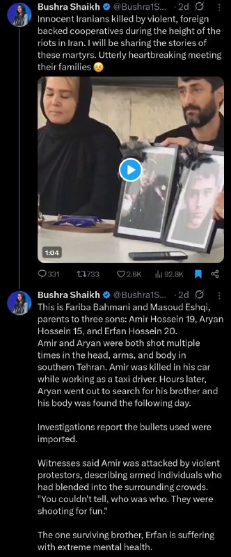 «آشوبگران مسلح بودند»در جریان دیدار گروهی از فعالان رسانهای و خبرنگاران خارجی مستقل با خانواده دو جوان جانباخته دیماه در جنوب تهران، اظهاراتی درباره نحوه کشتهشدن امیر و آرین عشقی مطرح شد. بشرا شیخ و جیک گرین در روایتهای جداگانهای مدعی شدند این دو نوجوان در جریان ناآرامیها هدف گلوله قرار گرفتهاند و درباره منشأ سلاحهای استفادهشده نیز ادعاهایی را مطرح کردند.