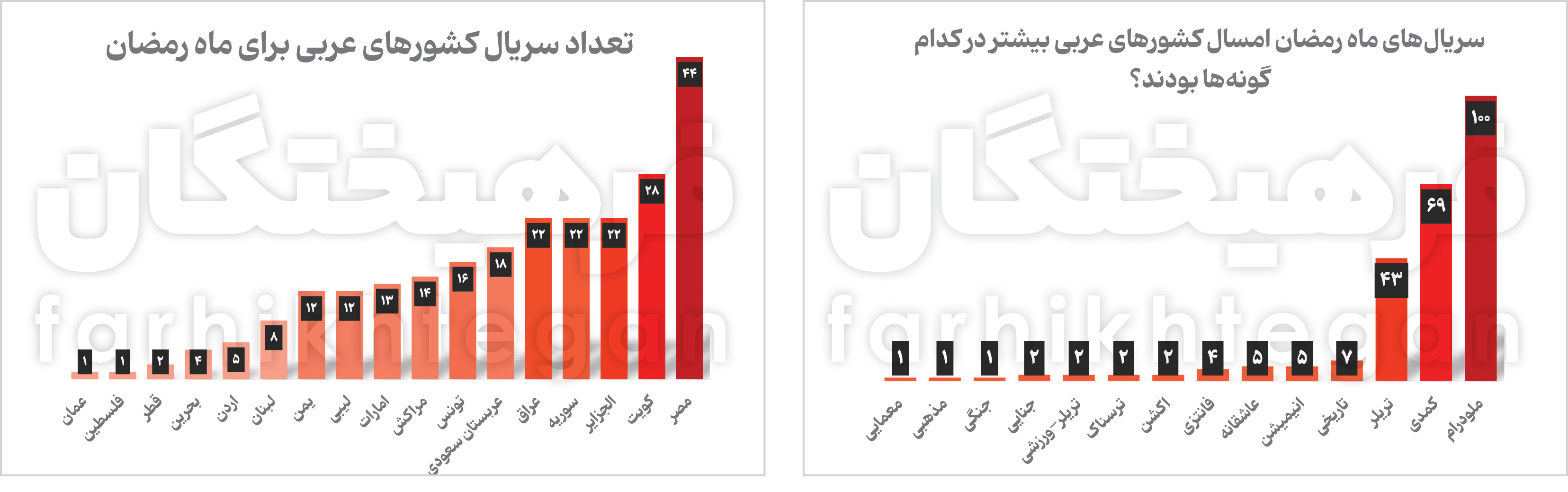 مصری‌ها سال گذشته 38 سریال برای ماه رمضان تولید کردند. البته گمان نکنید که تمام این سریال‌ها منحصراً از تلویزیون ملی مصر پخش شده‌اند بلکه، این آماری است که از پخش سریال‌های مصری در تمام پلتفرم‌های عربی برای ماه رمضان امسال به دست آمده است. بخش مهمی از این سریال‌ها با کمک صندوق سرمایه‌گذاری عمومی عربستان ساخته شده‌اند. این صندوق پولش را منتقل کرده به پلتفرم‌های «شاهد»، «ام بی سی» و «watch in» و به‌واسطه آن‌ها در تولید و پخش سریال‌های مصری مشارکت می‌کند. حاصل این مشارکت و تولیدات تماماً داخلی مصری‌ها شده ‌است، 44 سریال مصری‌ها برای ماه رمضان امسال که حدود 20 مورد از این تولیدات با سرمایه‌گذاری سعودی ساخته شده است. از این 44 سریال 11 سریال ملودرام، 15 تریلر، 6 کمدی و 12 سریال هم در باقی ژانر‌هاست.
