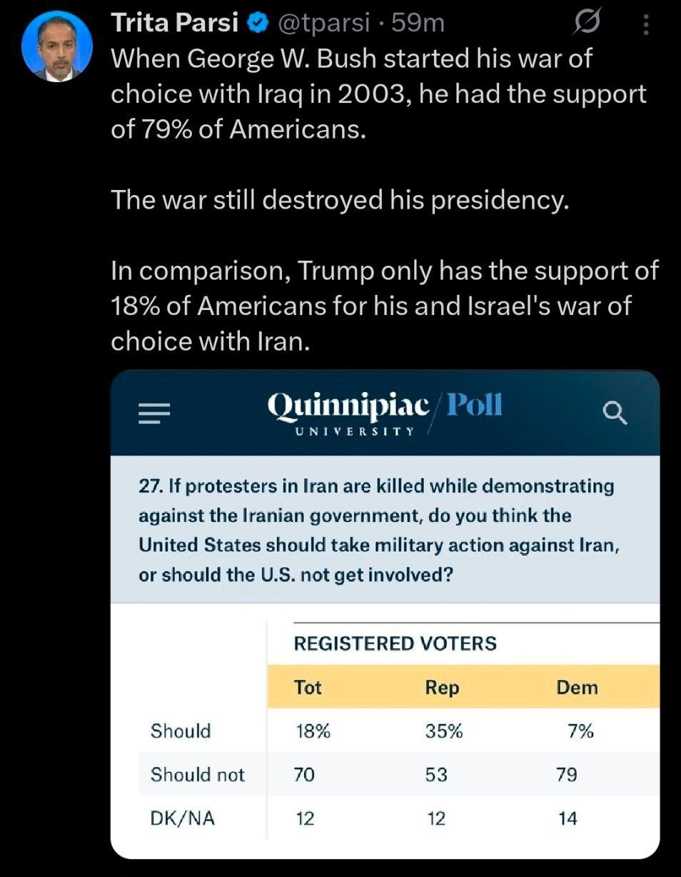 تریتا پارسی، تحلیلگر مسائل بینالملل نوشت: وقتی جورج دبلیو بوش در سال ۲۰۰۳ جنگ انتخابی خود علیه عراق را آغاز کرد، از «حمایت ۷۹ درصدی آمریکاییها» برخوردار بود. با این حال، آن جنگ در نهایت ریاستجمهوری او را نابود کرد.