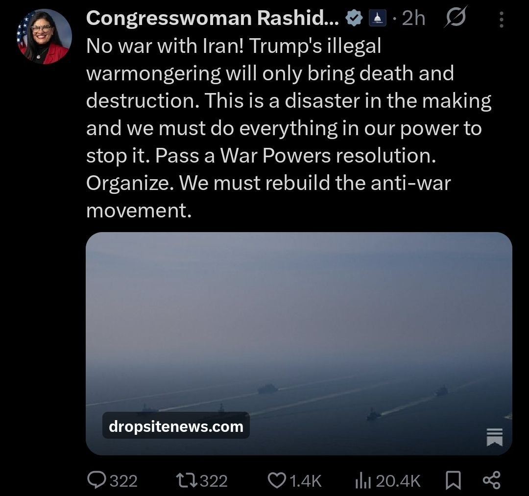 رشیده طلیب، نماینده فلسطینیتبار و عضو طیف ترقیخواه کنگره آمریکا، با انتقاد از مواضع جنگطلبانه دونالد ترامپ درباره ایران نوشت: نه به جنگ با ایران! جنگافروزی غیرقانونی ترامپ چیزی جز مرگ و ویرانی به همراه نخواهد داشت. این بحرانی است که میتواند به فاجعهای تمامعیار تبدیل شود و ما باید با تمام توان برای جلوگیری از آن اقدام کنیم.