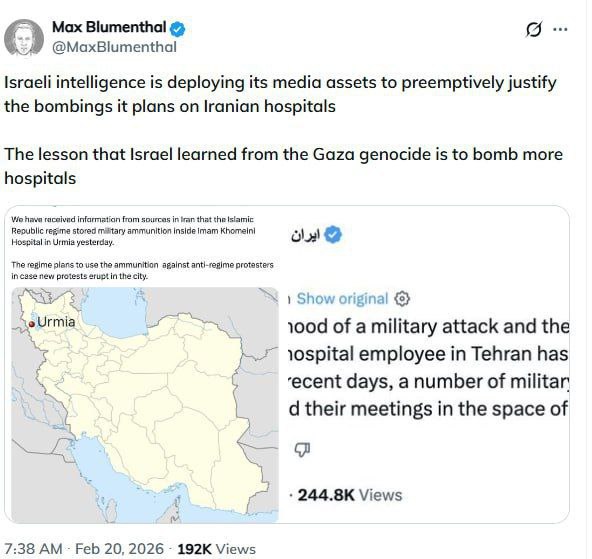 مکس بلومنتال با انتقاد شدید از سیاستهای تجاوزکارانه اسرائیل اظهار داشت: «این رژیم از رسانهها برای مشروع جلوه دادن حملات نظامی علیه تأسیسات حیاتی ایران، بهویژه بیمارستانها، استفاده میکند؛ اقدامی که نقض آشکار قوانین بینالمللی و حقوق بشر است و جان غیرنظامیان را تهدید میکند.»