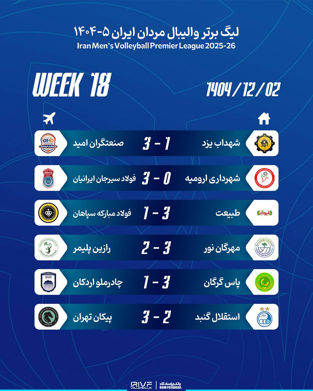 فرهیختگان: هفته هجدهم مسابقات والیبال قهرمانی باشگاههای برتر مردان ایران (شنبه دوم اسفند) به صورت متمرکز در سه سالن زندهیاد محمدرضا یزدانیخرم، خانه والیبال تهران و شهید بیضایی اسلامشهر پیگیری شد و تیمهای پاس گرگان، صنعتگران امید، طبیعت اسلامشهر، پیکان، فولاد سیرجان و مهرگان نور موفق به شکست دادن حریفان خود شدند.