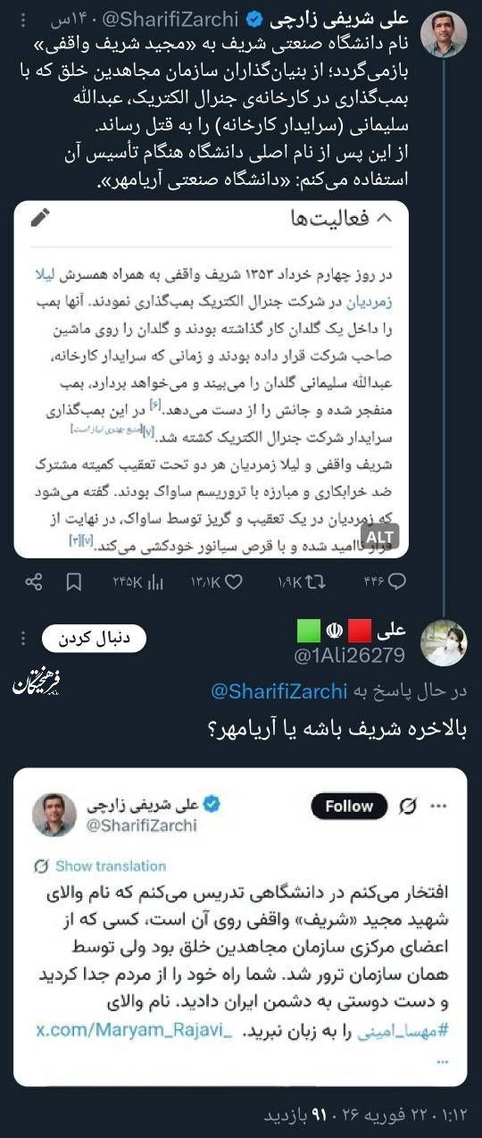 فرهیختگان آنلاین: شریفی زارچی استاد گریخته به چین در جدیدترین تناقض گویی خود مدعی شده است که نام دانشگاه شریف از اسم شخصیتی گرفته شده است که جزء مجاهدین خلق بوده پس باید تغییر کند.
