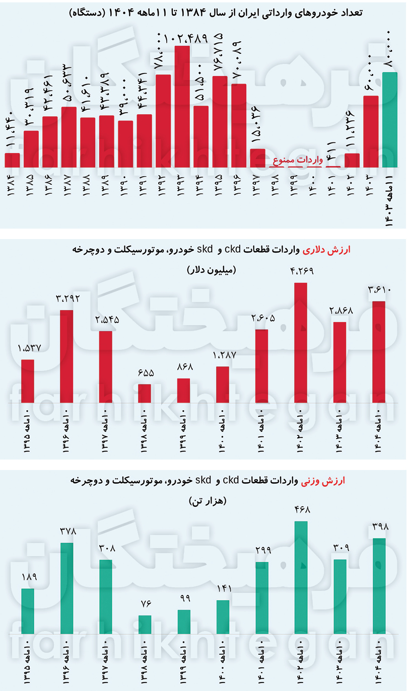 نگاهی به وضعیت واردات خودرو از سال 1384 تاکنون نشان می‌دهد عدد واردات امسال یعنی 80 هزار دستگاه جزء بالاترین اعداد واردات خودرو طی این مدت بوده است، به‌طوری‌که به جز سال 1393 که واردات آن بیش از 102 هزار دستگاه بوده، در سایر سال‌های این دوره ۲۱ساله همواره عدد واردات خودرو پایین‌تر از سال 1404 است. همچنین واردات در سال‌های 1398 تا 1400 ممنوع بوده و در سال 1401 تنها 411 دستگاه، در سال 1402 تعداد 11 هزار و 236 دستگاه و در سال 1403 تعداد 60 هزار دستگاه خودرو وارد کشور شده است. نکته قابل تامل اینکه حتی در سال‌های 1395 و 1396 نیز که برجام امضا شده بود تعداد واردات به ترتیب 77 و 70 هزار دستگاه بوده است.