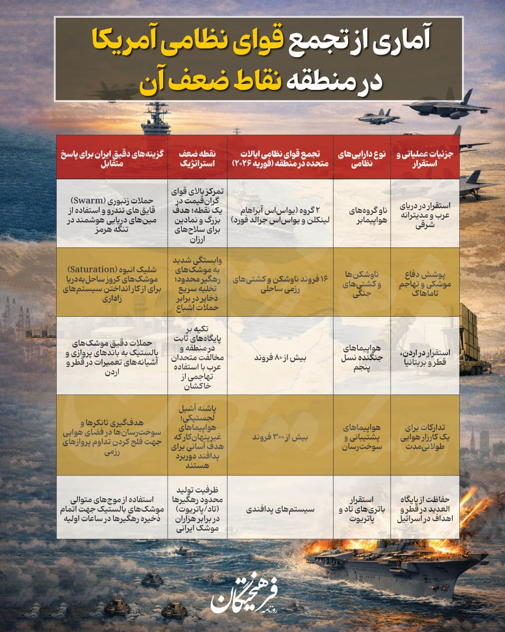 ایالات متحده برای محافظت از نیروهای خود در برابر واکنش ایران، سیستمهای پدافند موشکی خود را در سراسر منطقه مستقر کرده است. اما این استقرار، یک بازی با اعداد خطرناک است. تعداد موشکهای بالستیک ایران بسیار بیشتر از رهگیرهای موجود در منطقه تخمین زده میشود. در صورتی که ایران از تاکتیک «اشباع پدافند» استفاده کند، پایگاههای آمریکا در قطر، بحرین و امارات متحده عربی مستقیماً هدف قرار خواهند گرفت. ژنرال کین به درستی اشاره کرده است که تمرکز بیش از حد قوا در منطقه، ریسک تلفات انسانی بالا را افزایش میدهد، که خود میتواند جرقهای برای یک جنگ ناخواسته و کنترلناپذیر باشد.