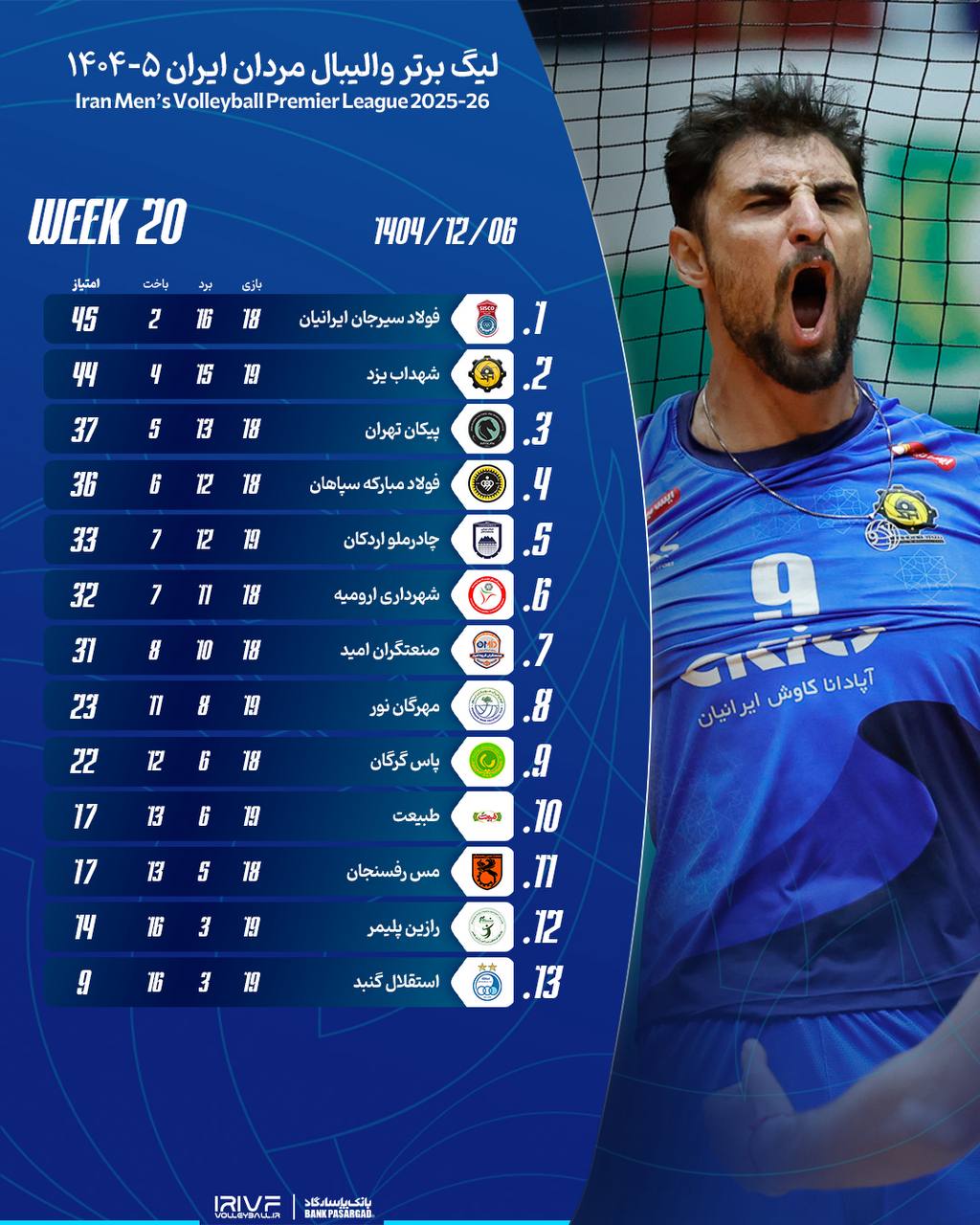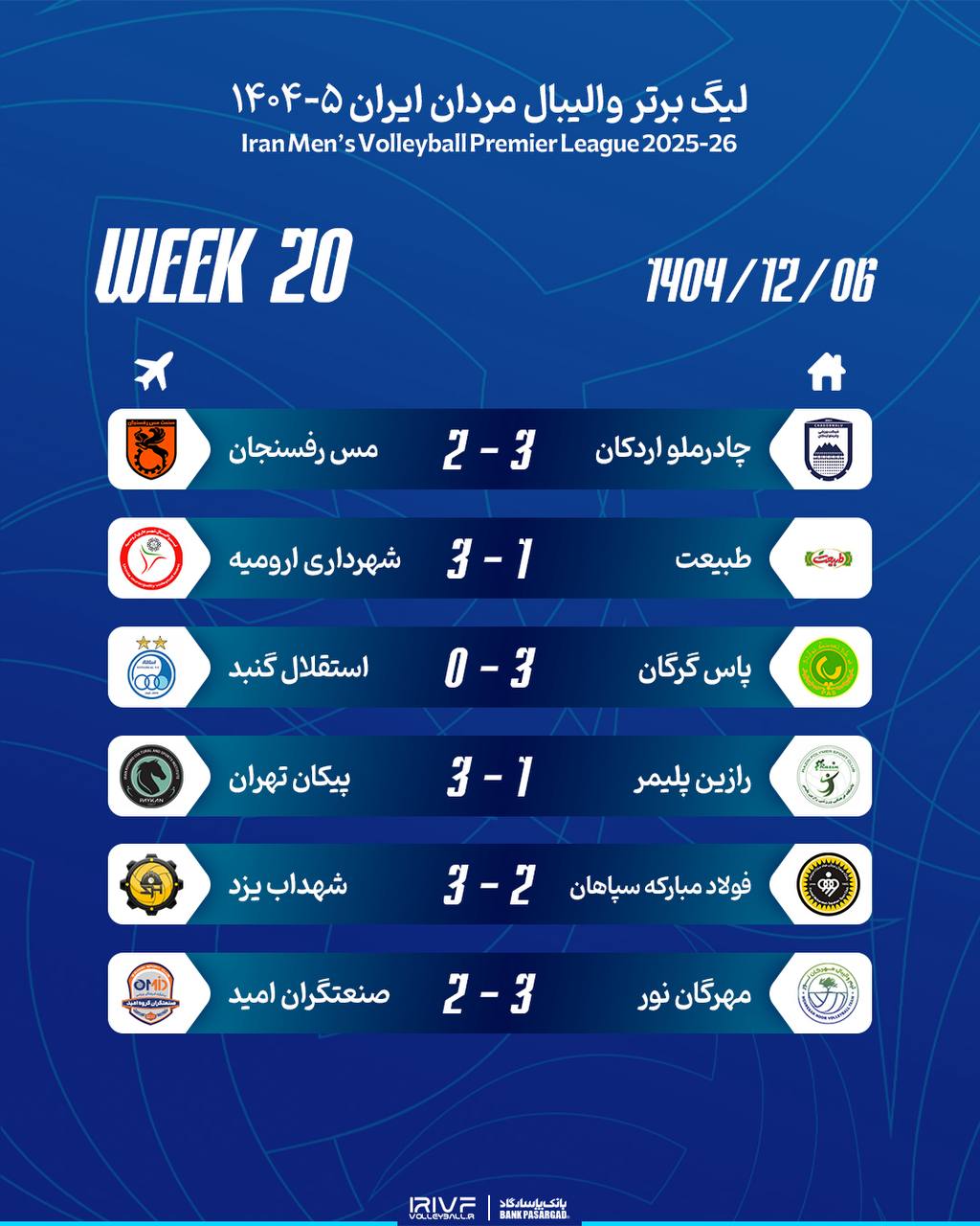 فرهیختگان: هفته بیستم مسابقات والیبال قهرمانی باشگاههای برتر مردان ایران (چهارشنبه ششم اسفند) به صورت متمرکز در سه سالن زندهیاد محمدرضا یزدانیخرم، خانه والیبال تهران و شهید بیضایی اسلامشهر پیگیری شد و در روز استراحت فولاد سیرجان صدرنشین ، تیمهای پاس گرگان، شهداب یزد، چادرملو اردکان، پیکان، مهرگان نور و شهرداری ارومیه موفق به شکست دادن حریفان خود شدند.
