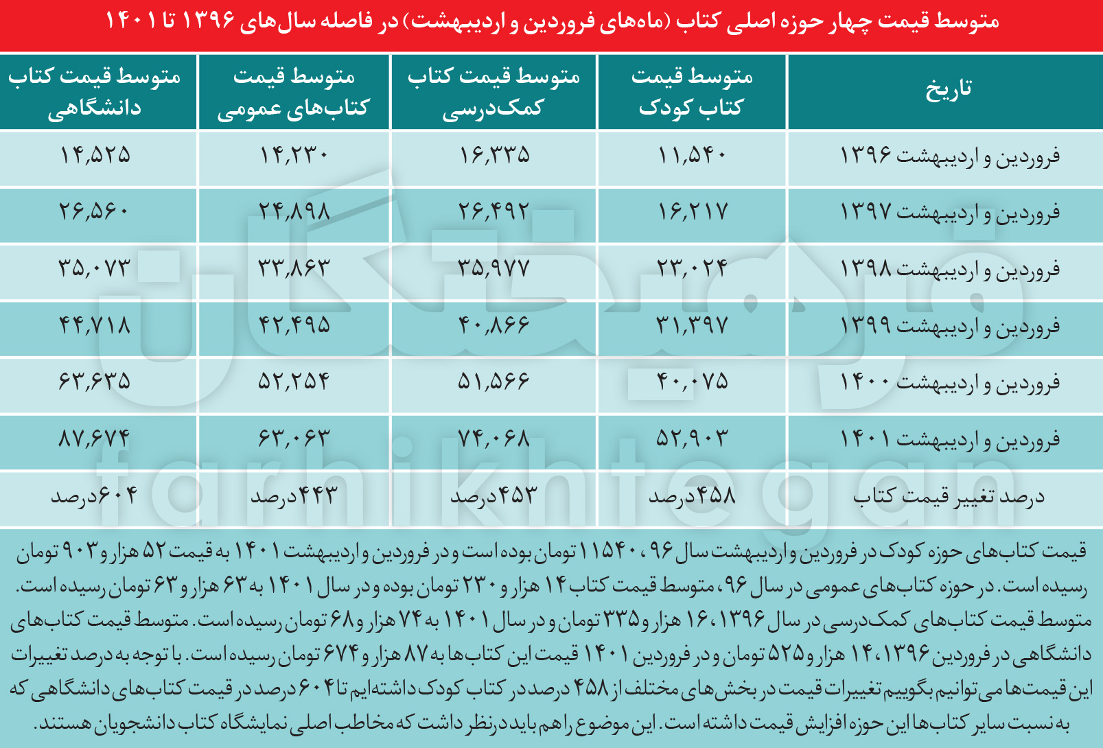 با قیمتهایی که در اردیبهشت 1401 در همین گزارش منتشر کردیم، اگر این خانواده چهارنفره بخواهند دو کتاب در حوزه کودکونوجوان، سه کتاب در حوزه عمومی برای پدر و مادر، یک کتاب کمکدرسی و دو کتاب دانشگاهی بخرند درمجموع باید حدود 600 هزار تومان را در نظر بگیرند که حتی از این مقدار پولی هم که ما در نظر گرفتیم بیشتر شده است، البته این را هم باید بدانیم که این قیمتها متوسط قیمت هر کتاب است و ممکن است که گرانتر از این هم بشود. در جدولی که برای قیمت کتاب در نظر گرفتهایم میتوانیم ببینیم مثلا چقدر کتابهای عمومی طی این 6 سال گران و حدودا 4/5 برابر شده است و این در حوزههای مختلف قابلرویت است و نمیشود از کنار این گرانی بهراحتی گذشت.