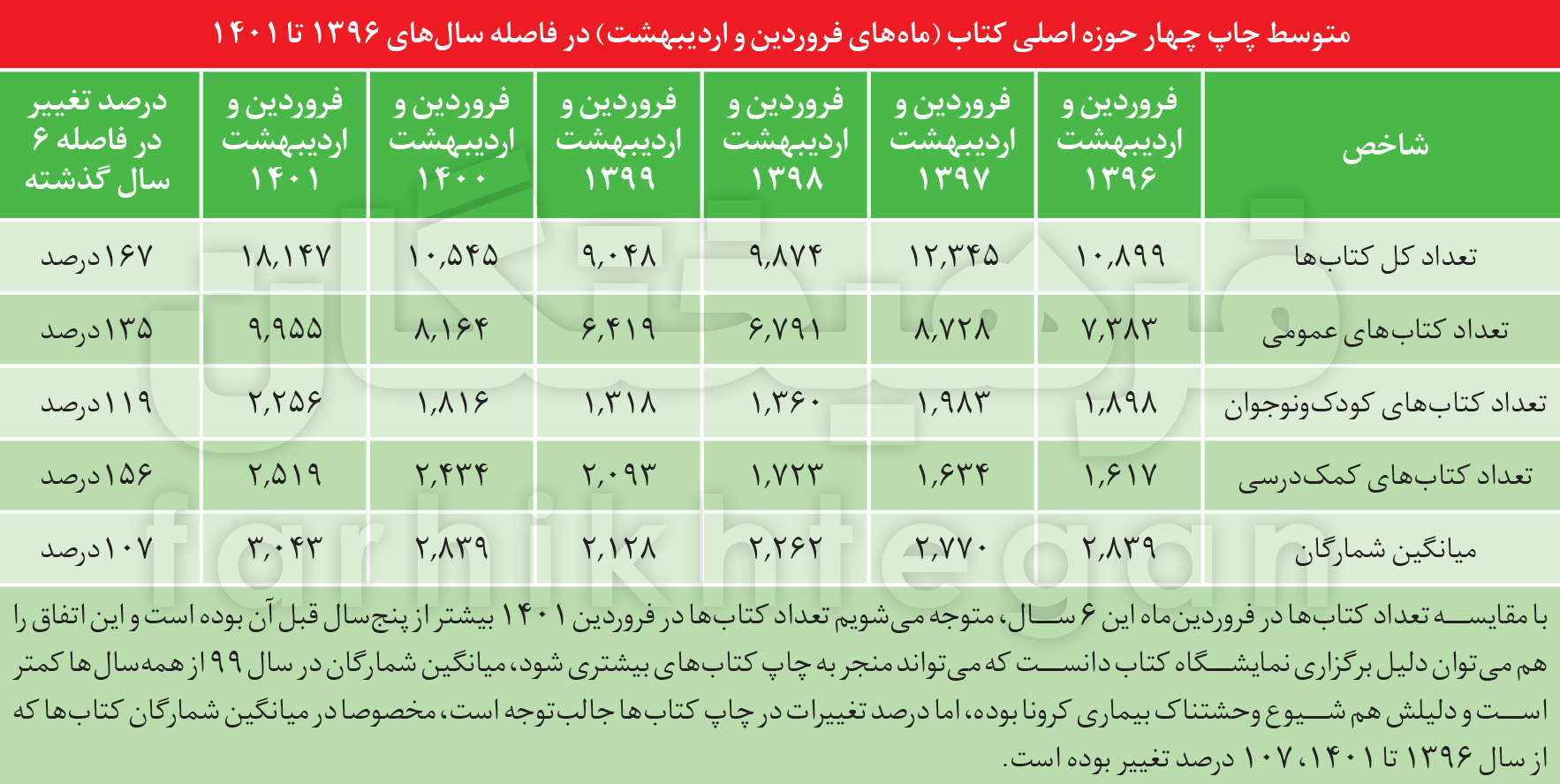 در فروردین سال 1401، تعداد 18147، کتاب منتشرشده است. تعداد کتابهای عمومی 9955 عنوان، 2256نوان کتابهای کودکونوجوان، 2519 عنوان کتابهای کمکدرسی، میانگین شمارگان 3043 عنوان بوده است.