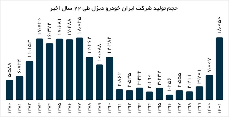 بررسیها نشان میدهد کارخانه ایران خودرو دیزل که در سال 1399 با زیان انباشته بیش از 6 هزار میلیارد تومانی در آستانه انحلال بوده است طی سال گذشته توانسته است علاوه بر جابجایی رکورد تولید 64 ساله خود، سود انباشته حدود 3 هزار میلیارد تومانی را به جا بگذارد. روز یکشنبه ۷ خرداد در نشستی که به همت سازمان بورس و اوراق بهادار برگزار شد رئیس هیئت مدیره شرکت ایران خودرو دیزل بیان کرد: طی سال 1401 رکورد تولید این شرکت با تولید 18 هزار و 50 دستگاه اعم از انواع اتوبوس، کامیون سبک و سنگین، کشنده، پیکاپ و ون، شکسته شد. در این خصوص بررسیها نشان میداد میزان تولید خودرو در ایران خودرو دیل طی سالهای ۱۳۸۰ تا ۱۳۹۰ رکورد ۱۸ هزار و ۲۵ دستگاه را داشته که البته لازم به توضیح است که از این مقدار نیز حدود ۴ هزار و ۷۰۰ دستگاه بصورت خودروهای CBU بوده که نمیتوان به معنای تولید کامل دانست اما با اینحال از سال ۱۳۹۱ تا سال ۱۳۹۹ تولید این شرکت با کاهش شدیدی روبهرو بود و در میانگین ۲ هزار تا ۳ هزار دستگاه در نوسان بود تا در نهایت در سال ۱۴۰۰ این روند معکوس شده و در این سال به بیش از ۷ هزار دستگاه میرسد تا در نهایت رکورد بیش از ۱۸ هزار دستگاه که در طول تاریخ این شرکت بیسابقه بوده را به ثبت برساند.