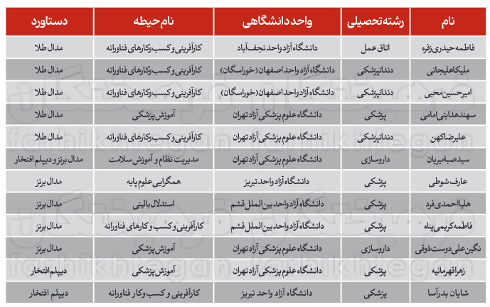 لازم به ذکر است در پایان این مراسم، از دانشجویان دانشگاه آزاد برگزیده در پانزدهمین المپیاد دانشجویی علوم پزشکی کشور تقدیر شد. اسامی برگزیدگان به شرح زیر است: