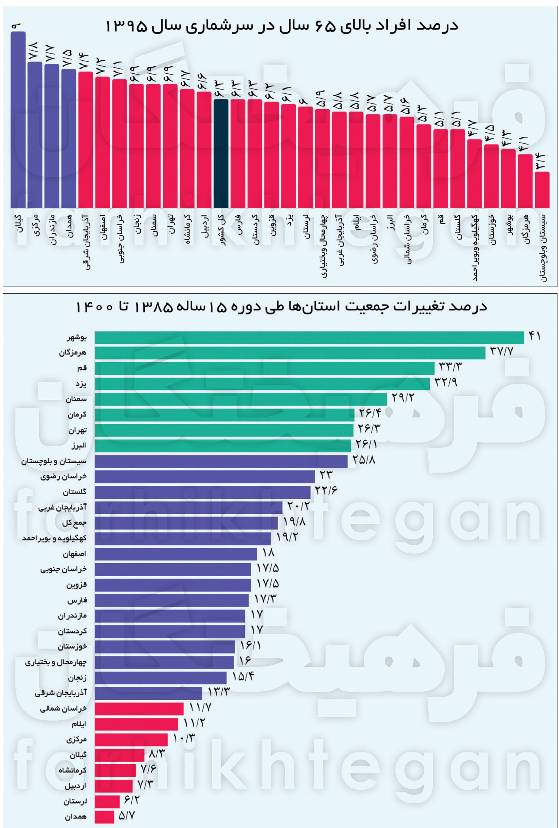 به دلیل عدم توزیع فضایی یكسان جمعیت و نیز امكانات و خدمت و درنتیجه تفاوت در سطوح توسعهیافتگی مناطق مختلف کشور، الگوهای مهاجرتی متفاوتی در هر منطقه شکل گرفته است. بنابر تئوریهای مختلف مهاجرتی، بهویژه تئوری جاذبه و دافعه، مناطق مختلف بهلحاظ داشتن امتیازات و امكانات یا در نقطه مقابل بهدلیل محرومیتها و ضعفها، دارای جاذبه و دافعههای مختلفی هستند که توازن این دو الگوی مهاجرتی را شكل میدهند. مناطقی که عوامل جاذبه آنها بیشتر از عوامل دافعه مبدأ باشند، نسبتی از جمعیت مبدأ را به خود جذب میکنند و در این مبادله جمعیتی بیشترین سود جمعیتی را خواهند داشت. ایران نیز از این قاعده مستثنی نیست. تنوع و گستردگی اقلیمی از یكسو و تفاوت و عدم توازن سطح توسعهیافتگی استانی از سوی دیگر، جریانها و الگوهای مهاجرتی مختلفی را کشور شكل داده است. در این مبادله جمعیتی، استانهایی که بهدلیل بالاتر بودن سطح توسعهیافتگی، بیشترین عوامل جاذبه را دارند، مهاجران بیشتری را در خود جایی دادهاند. بررسی دادههای مهاجرت نشان میدهد که بهصورتکلی عمده استانهای کشور، مهاجرفرست هستند و در جریان مهاجرت با خروج بیشتر مهاجران به توازن منفی دست یافتهاند، اما این الگو پیامدهای اقتصادی- اجتماعی قابلتاملی را برای برخی استانها بهجای گذاشته است. یکی از این پیامدها، اثر آن بر تغییر تعداد کل جمعیت است. بررسی آمارهای مرکز آمار ایران از سال 1385 تا 1390 در 31 استان کشور (جمعیت سال 1385 استان البرز بازسازی شده) نشان میدهد طی این دوره 15 ساله، جمعیت استان بوشهر با 41 درصد افزایش، بیشترین افزایش را در میان 31 استان به خود اختصاص داده است. هرمزگان با افزایش 37.7 درصدی در رتبه دوم، قم با 33.3 درصد سوم، یزد با 32.9 درصد چهارم، سمنان با 29.2 درصد پنجم، کرمان با 26.4 درصد ششم، تهران با 26.3 درصد هفتم، البرز با 26 درصد هشتم، سیستانوبلوچستان با 25.8 درصد نهم و خراسان رضوی با 23 درصد دهم بودهاند. اما طی این دوره 15 ساله، جمعیت استان همدان فقط 5.7 درصد افزایش داشته است. پس از این استان، جمعیت استان لرستان با 6.2 درصد، اردبیل با 7.3 درصد، کرمانشاه با 7.6 درصد، گیلان با 8.3 درصد، مرکزی با 10.3 درصد، ایلام با 11.2 و خراسان شمالی با 11.7 درصد، هشت استانی هستند که طی دوره 15 ساله 1385 تا 1400 کمترین افزایش جمعیت را داشتهاند. از آنجا که نرخ زادوولد و همچنین نرخ باوری در این استانها متفاوت است، باید گفت اصلیترین عامل این تغییرات جمعیتی در استانها، عامل مهاجرت و پس از آن، زادوولد است.