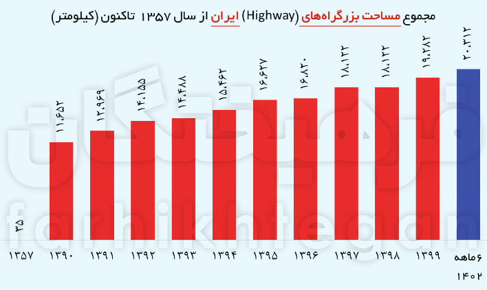 مقایسه آمارهای حملونقلی کشور نشان میدهد بین سالهای 1392 تا 1399 (انتهای 1391 تا انتهای 1399) مساحت جادههای کشور از 180 هزار و 292 کیلومتر با رشد 9.7 درصدی به 197 هزار و 770 کیلومتر رسیده است. این درحالی است که بین سالهای 1400 تا نیمه نخست 1402 مساحت راههای کشور با رشد 11.8 درصدی از 197 هزار و 770 کیلومتر به 221 هزار و 193 کیلومتر رسیده است. آمارها نشان میدهد رشد مساحت بزرگراهی کشور از سال 1392 تا 1399 حدود 49 درصد و مساحت آزادراهی کشور حدود 24.8 درصد بوده است. طبق این آمارها، طی دو سال اخیر رشد مساحت بزرگراهی کشور 5.3 و رشد مساحت آزادراهی کشور 10.2 درصد بوده است. گرچه بخشی از پروژههای افتتاح شده در این دولت، در دولت قبل ساخته شده، اما این موضوع در دولت روحانی نیز مسبوق به سابقه بوده است. این آمارها نشان میدهد عملکرد دولت روحانی به واسطه کاهش بودجه عمرانی کشور ضعیفتر از دولت فعلی و البته ضعیفتر از دولت نهم و دهم نیز بوده است.