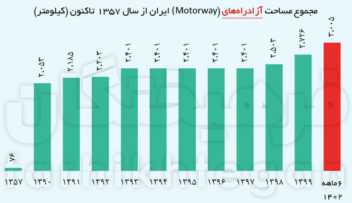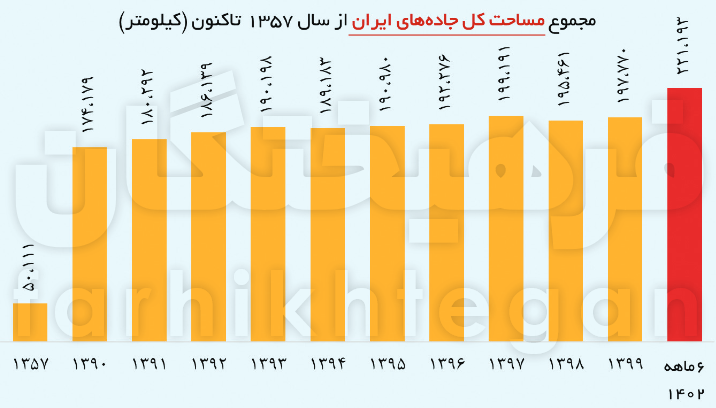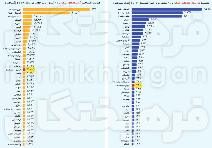 گفته شده براساس گزارشهای وزارت راه و شهرسازی و سازمان راهداری و حملونقل جادهای کشور مجموع مساحت جادههای ایران تا روزهای اخیر به 221 هزار و 193 کیلومتر (راه برونشهری شامل آزادراهها، بزرگراهها، راههای اصلی، راههای فرعی و روستایی) رسیده است. مقایسه مجموع مساحت جادههای کشور با آمارهای بینالمللی نکات قابلأملی را نشان میدهد. طبق دادههای سازمان آمار اروپا (Eurostat)، شورای اقتصادی و اجتماعی سازمان ملل متحد (ECOSOC) و دادههای پایگاه دادهای Statista ، ایران با داشتن 221 هزار و 193 کیلومتر مساحت جادهای، در رتبه 23 جهان ایستاده است. در این رتبهبندی آمریکا با نزدیک به 6.6 میلیون کیلومتر، چین با حدود 4.8 میلیون کیلومتر و هند با 4.7 میلیون کیلومتر به ترتیب سه کشوری هستند که بالاترین مساحت جادهای (شهری و روستایی و شوسه و آسفالت) را دارند. برزیل، روسیه و ژاپن به ترتیب در رتبههای چهارم تا ششم قرار دارند. کانادا، فرانسه، استرالیا، آفریقایجنوبی، اسپانیا، آلمان، سوئد، اندونزی، ایتالیا، فنلاند، لهستان، انگلستان، مکزیک، پاکستان، آرژانتین و عربستان نیز در رتبههای ۷ تا ۲۲ و قبل از ایران قرار دارند. گرچه این آمار و ارقام یک آمار خام و بدون در نظر گرفتن شاخصهای مختلف اعم از مساحت کشور، سرانه راه و سرانه خودرو و سایر شاخصهای دیگر است اما قرار گرفتن ایران در رتبه 23 در بین حدود 200 کشور موضوع حائز اهمیتی است بهویژه اینکه کشورمان طی 12 سال اخیر بهواسطه محدودیتهای ظالمانه تحریمی، کسری بودجه، تورمهای بالا و کاهش سهم بودجه عمرانی از بودجه کل، مشکلات زیادی برای توسعه حملونقل عمومی و زیرساختهای جادهای داشته، رتبه 23 برای ایران عملکرد قابل دفاعی است.