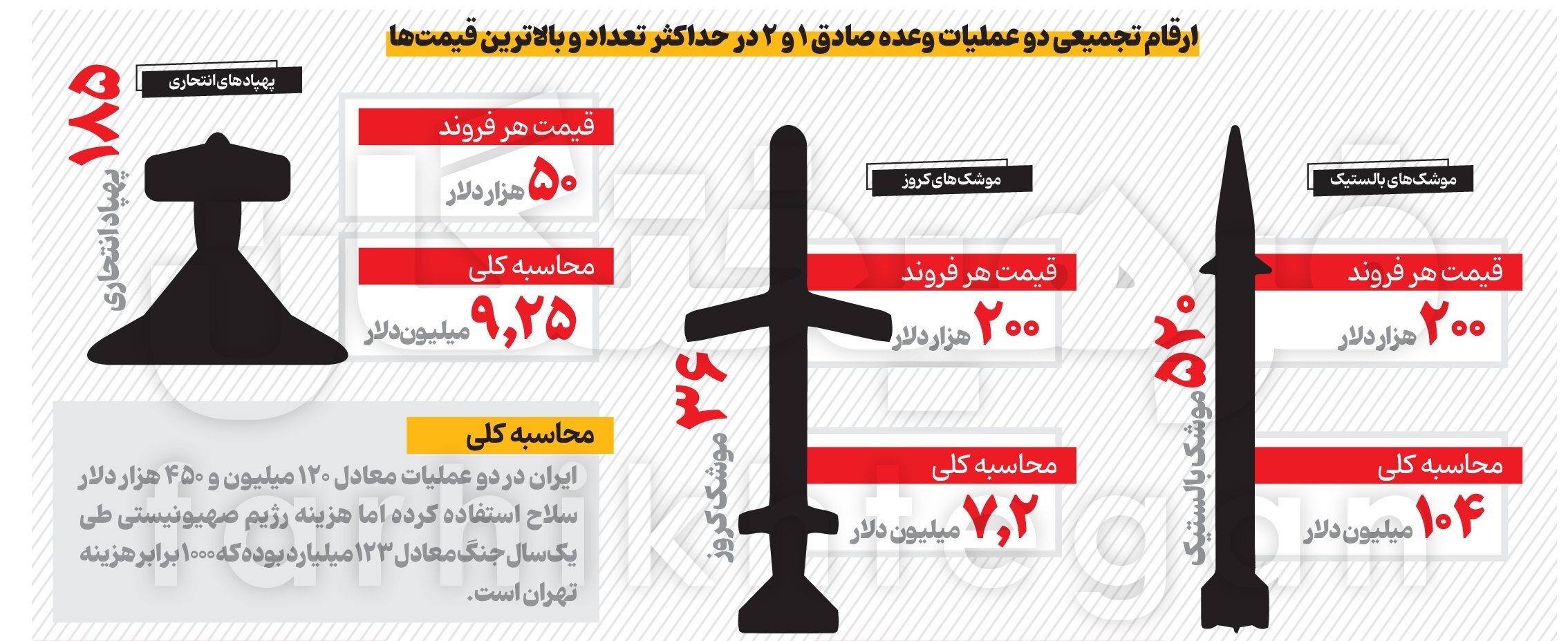 بالاترین هزینه بهدست آمده بر مبنای حداکثر تعداد و حداکثر قیمت سلاحهای استفاده شده در دو عملیات وعده صادق، نشان میدهد ایران در مجموع برای هدف قرارداد سرزمینهای اشغالی 120 میلیون و 450 هزار دلار هزینه کرده است.