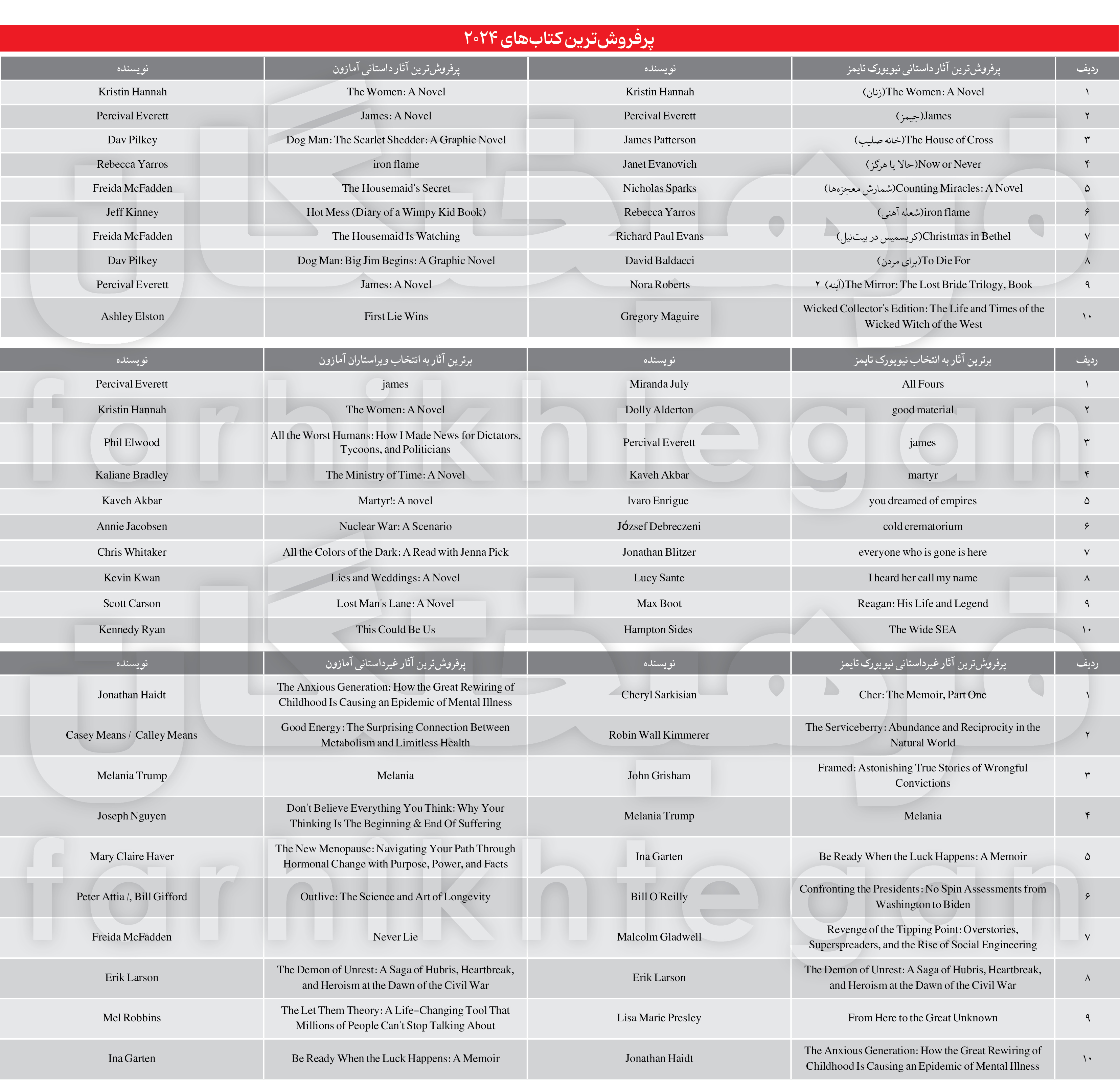 در یک نگاه کلی به این جدول پرفروشهای سال 2024 آنچه در جدول سال اخیر پررنگ است و به چشم میخورد مسئله فروش زندگینامههاست. زندگینامههایی که هم مورد توجه مخاطبان آمازون قرار گرفته و هم مخاطبان نیویورکتایمز.