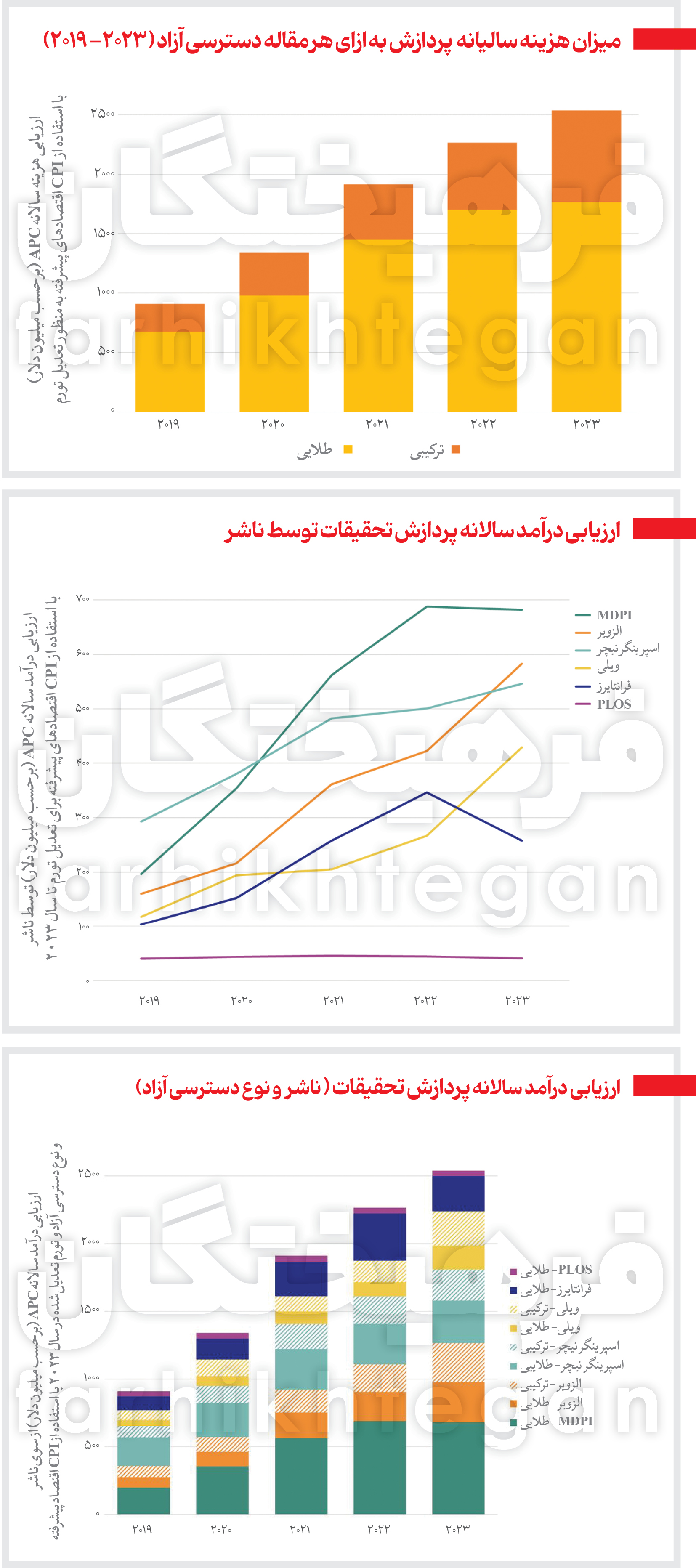 با برآوردهایی که روی تعدیل تورم انجام شده، مشخص شد که 73 درصد از کل هزینهها رو مجلات طلایی با دسترسی آزاد اعمال شده است که سه ناشر از جمع 6 ناشر بزرگ دنیا را در بر میگیرد و در این میان، MDPI و فرانتایرز بالاترین تعداد مقالات با دسترسی آزاد را منتشر می کنند. هزینههای مجلات طلایی با دسترسی آزاد با رشد 162 درصدی از 674 میلیون و 100 هزار دلار در سال 2019 به یک میلیارد و 767 میلیون دلار در سال 2023 رسید و هزینههای مجلات ترکیبی نیز با رشد 226 درصدی از 236 میلیون و 200 هزار دلار به 771 میلیون دلار و 100 هزار دلار رسید.