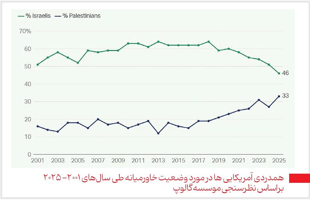 با وجود فشارهای آمریکا برای حفظ حمایت بیچونوچرا از اسرائیل این کشور نتوانسته جلوی این تغییر را بگیرد. نظرسنجی اخیر مؤسسه گالوپ که در فوریه ۲۰۲۵ انجام شده، نشاندهنده تغییری چشمگیر در افکار عمومی آمریکا نسبت به مناقشه اسرائیل و فلسطین است. این دادهها حاکی از آن است حمایت از اسرائیل در میان آمریکاییها به پایینترین سطح خود در ۲۵ سال گذشته رسیده و برای اولین بار از سال ۲۰۰۰، کمتر از نیمی از مردم این کشور (۴۶ درصد) اعلام کردهاند از اسرائیل حمایت میکنند. در مقابل، حمایت از فلسطین به ۳۳ درصد افزایش یافته که بیش از دو برابر میزان آن در سال ۲۰۰۱ (۱۶ درصد) و بهطور قابلتوجهی بالاتر از ۱۳ درصد در سال ۲۰۰۳ است. این تحول بهویژه در میان دموکراتها برجستهتر است؛ جایی که حمایت از اسرائیل به ۲۱ درصد سقوط کرده، یعنی کمتر از نصف رقم ۴۳ درصد سال ۲۰۰۱. این کاهش معنادار در حمایت از اسرائیل، علیرغم فشارهای سیاسی و دیپلماتیک گسترده دولت آمریکا برای حفظ اتحاد استراتژیک با اسرائیل، رخ داده است. دولتهای متوالی آمریکا ازجمله دولت بایدن و اکنون دولت ترامپ، با ارسال کمکهای نظامی و مالی هنگفت و همچنین حمایت سیاسی بیقیدوشرط از اسرائیل، سعی در تحکیم این رابطه داشتهاند. با این حال به نظر میرسد افکار عمومی آمریکا بهویژه در میان نسل جوان و دموکراتها، تحت تأثیر عواملی چون تصاویر جنگ غزه، گزارشهای نقض حقوق بشر و گسترش آگاهی از وضعیت فلسطینیان از طریق شبکههای اجتماعی، به سمت همدلی بیشتر با فلسطین چرخش کرده است.