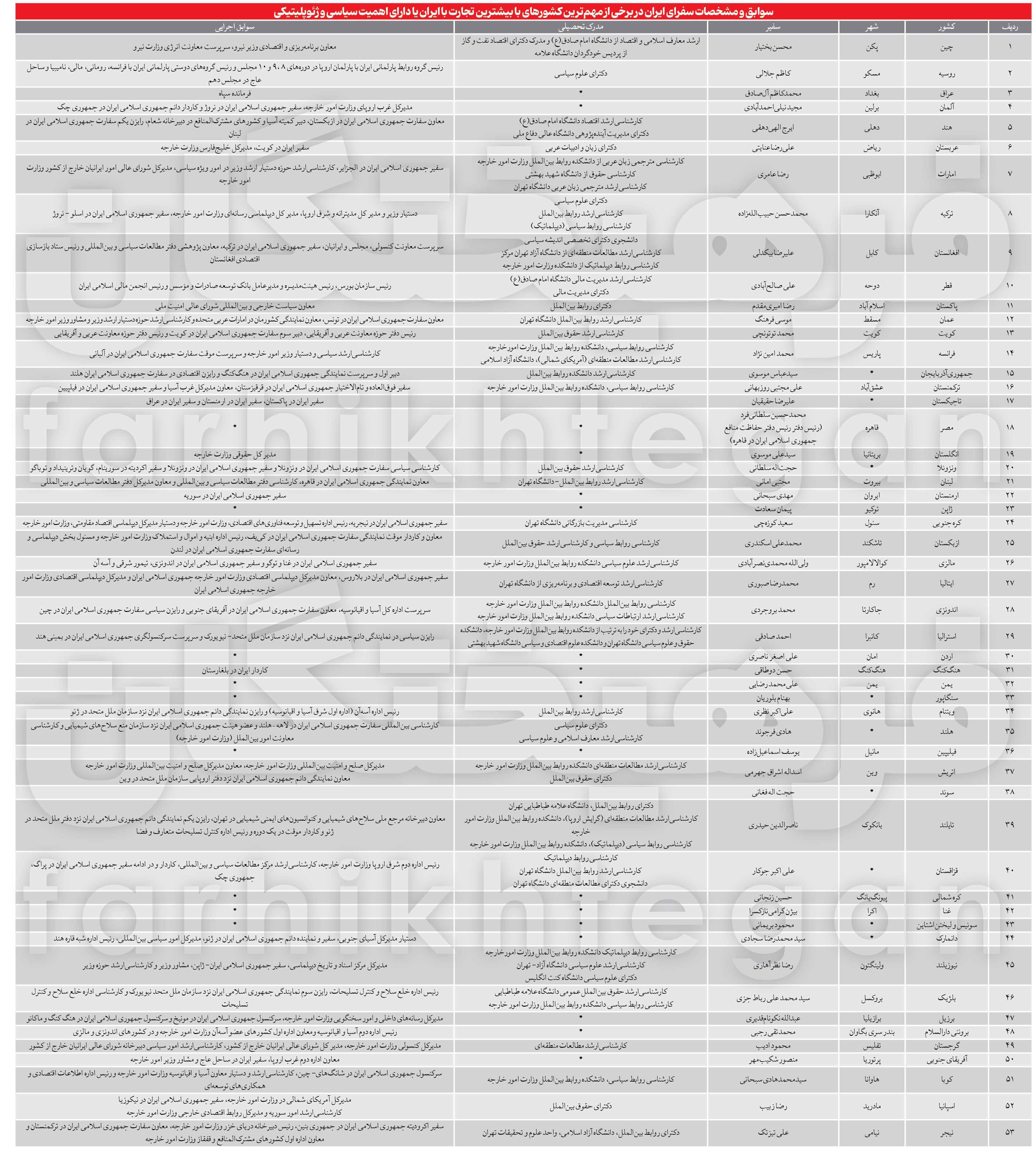 پانیذ رحیمی،خبرنگار گروه اقتصاد: «8 ماه است که از بازگشت آقای دکتر بختیار سخن میگویند. او که بهعنوان سفیر ما در چین منصوب شده، فردی موجه و محترم است. اما کار او شده بگردد، نمایشگاه و فرش ببیند و بفهمد کاسه چینی کجا خوشگلتر است و در نهایت اینها را استوری کند. در گذشته، هرگاه دیپلماتهای مسلط، ارشد و درجهیک در چین داشتیم، وضعیت ما بهتر و روابطمان مستحکمتر بود.» اینها بخشی از صحبتهای مجیدرضا حریری رئیس اتاق بازرگانی ایران و چین درباره سفیر ایران در چین است. «فرهیختگان» وضعیت سوابق اجرایی و تحصیلی سفیران ایران در ۵۳ کشوری که یا از شرکای اصلی تجارت خارجی ما هستند یا از اهمیت سیاسی و ژئوپلیتیکی برخوردارند، را بررسی کرده است. بررسیها نشان میدهد برخی از سفیران نه سابقه خاصی در امور دیپلماتیک داشته و نه چهره سیاسی یا اجتماعی و علمی هستند و نه وزنهای برای پذیرش در کشورهای دیگر هستند. اما این روزها دغدغه اصلی دلسوزان و کارشناسان حوزه روابط خارجی این است که همچنان افرادی بدون سابقه اجرایی و دیپلماتیک یا برخورداری از وجهه سیاسی و اجتماعی، عمدتاً بر اساس بدهبستانهای سیاسی در حال انتخاب شدن و اعزام به بزرگترین کشورهای جهان هستند. از این رو، انتظار این است که دولت چهاردهم در راستای کمک به ایجاد گشایشهای خارجی، تسهیل امور ایرانیان خارجنشین در سایر کشورها، تسهیل امور تجار و بازرگانان در خارج و ایجاد پیوندهای اقتصادی قوی با این کشورها، با کنار زدن بدهبستانهای سیاسی توانمندترین و معتبرترین دیپلماتها را راهی سفارتخانههای ایران کند.