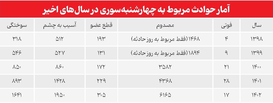 در سال 1401 یک درصد از مصدومان حوادث چهارشنبهسوری را نیروهای امدادی تشکیل میدادند. در سال 1402 نیز سه پرسنل انتظامی با پرتاب نارنجک دستساز مجروح شدند. گزارشها نشان میدهد در این روز خسارات قابلتوجهی هم به تجهیزات و ماشینهای امدادی وارد میشود. این را هم نمیتوان نادیده گرفت که بر اثر مراجعات به بیمارستان و اورژانسها تا چه میزان کادر درمان تحت فشار کاری برای جبران این آسیبها قرار میگیرند.