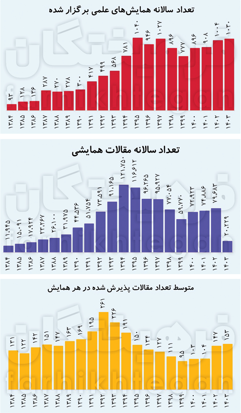 بهرغم مشکلات اقتصادی و بحرانها، روند برگزاری همایشها بهویژه از سال 1400 به بعد دوباره صعودی شده و میانگین تعداد مقالات هر کنفرانس به 153 مقاله در سال 1403 افزایش یافته، درکنار این تغییرات هزینههای برگزاری همایشها بهطور چشمگیری افزایش یافته است. از هزینههای برگزاری همایشهای یکروزه با هزینههای معمولی حدود 20 میلیون تومان تا همایشهای بزرگ با هزینههایی بالغ بر 700 میلیون تومان، تمامی این موارد نشاندهنده پیچیدگی و افزایش قابل توجه هزینههای برگزاری این رویدادهای علمی است. اما موضوع قابلتأمل در این میان، مسئله کیفیت و اثرگذاری نتایج مقالات همایشهای علمی است.