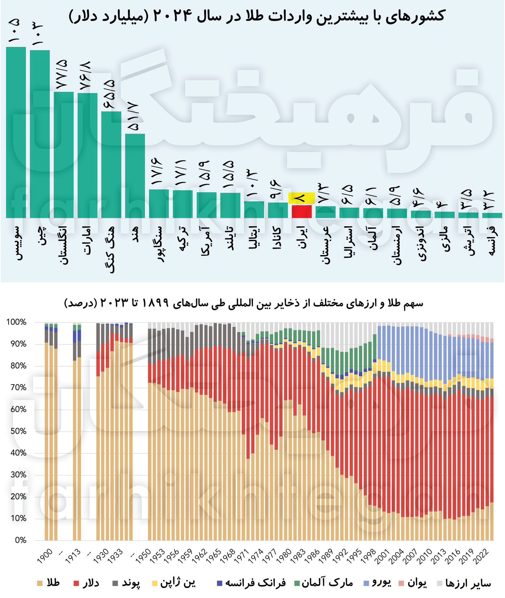 فاطمه سادات مرتضوی، خبرنگار گروه اقتصاد: سال 2024 در تمام جهان سال عجیبی بود، سرعت تحولات جهانی آن چنان بالا بود که به عقیده بسیاری از ناظران بینالملل، در حالت عادی و وضعیت نرمال، برای یک دهه جهان کافی بود. از کودتای غیرمنتظره در کرهجنوبی گرفته تا جنگ در غزه و اوکراین، جنگ تجاری چین و آمریکا هم به نوبه خود بازار جهانی را تحتتأثیر قرار داده، از طرفی شاید بتوان مهمترین این تحولات را روی کار آمدن مجدد دونالد ترامپ با کابینه جدید و خاص خود حساب کرد؛ مثلاً همین جنگ تعرفهای را هم که در نظر بگیریم در چند ماهه اخیر بازارهای جهانی را دچار نوساناتی عجیب کرده و باعث ثبت رکوردهای جدیدی در آن شده است. برای مثال در سهماهه پایانی 2024 رکورد جدیدی از ارزش طلا در جهان ثبت شد و طبق آمار شورای جهانی طلا ارزش آن در تمام دنیا به 111 میلیارد دلار رسید که عدد قابلتوجهی است. طبق آمار شورای جهانی طلا کشورهای سوئیس، چین، انگلستان و امارات بیشترین واردات طلا را در سال 2024 داشتهاند و سوئیس سهم 40 درصدی در واردات جهان دارد. این کشورها در سال 2024 به ترتیب 107،103،77 میلیارد دلار طلا وارد کردهاند و پرچمدار واردات طلا در جهان به شمار میروند. ایران همچنین در سال 2024 رقمی معادل 8 میلیارد دلار واردات طلا داشته و 12امین کشور واردکننده طلا در جهان است.