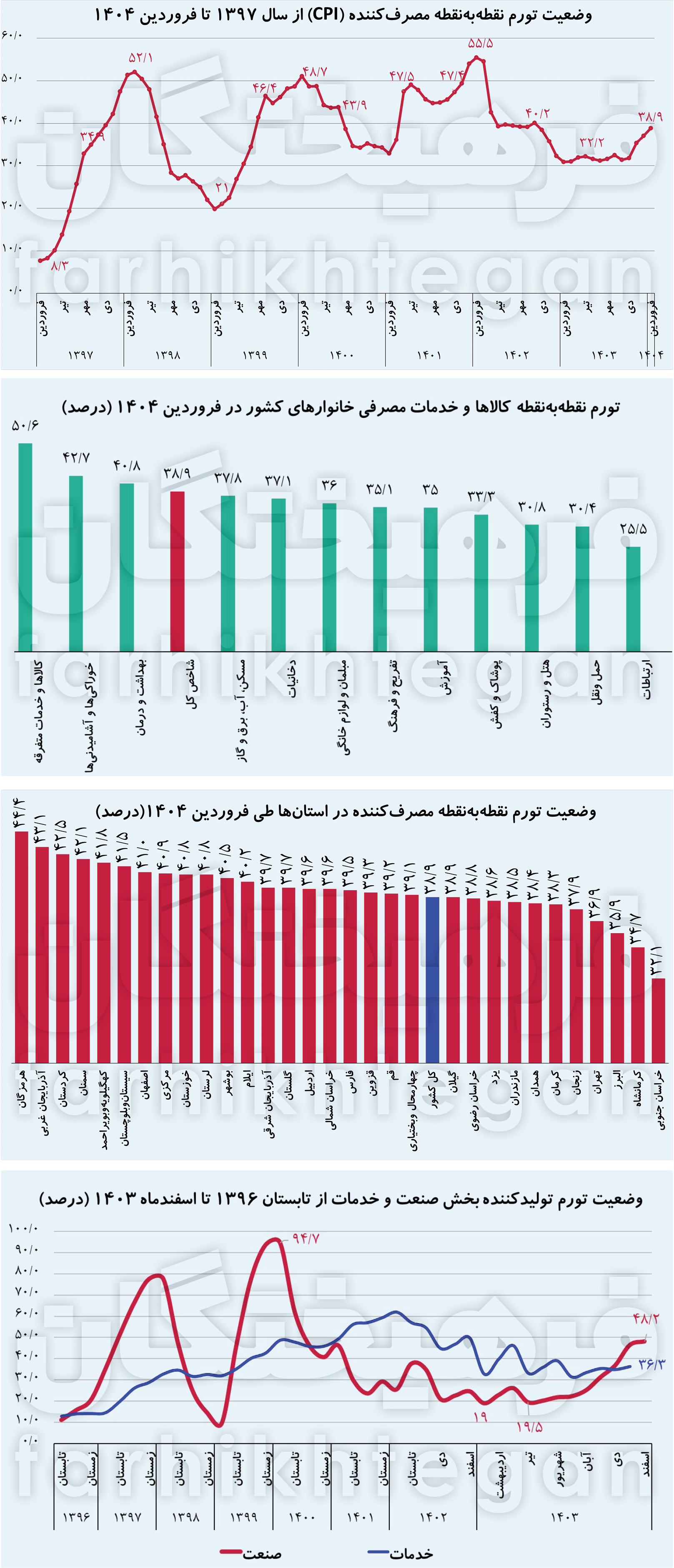 براساس دادههای مرکز آمار ایران، در فروردین ماه شاخص کل به 328.1 رسیده که نشان از تورم ماهانه 3.9 درصدی، تورم نقطهای 38.9 درصدی و تورم سالانه 33.2 درصدی است. براساس این دادهها، بیشترین تورم ماهانه و نقطهای به مناطق روستایی تعلق دارد، بهطوریکه طی فروردین درحالی تورم کل ماهانه 3.9 درصد و تورم ماهانه شهری 3.8 درصد بوده، این میزان برای مناطق روستایی 4.7 درصد است. همچنین درحالی طی فروردین تورم نقطهای برای کل کشور 38.9 درصد و برای مناطق شهری 38.5 درصد بوده، این میزان برای مناطق روستایی 41.1 درصد است. براساس دادههای مرکز آمار ایران، تورم نقطه به نقطه فروردین ماه بالاترین تورم نقطهای از آذرماه سال 1402 تاکنون بوده است، بهطوریکه تورم نقطهای از 40.2 درصد در آذرماه سال 1402 به 31 درصد در ماههای فروردین تا آذرماه 1403 رسیده بود که این مقدار در سه ماه اخیر روند صعودی به خود گرفته و به 38.9 درصد در ماه گذشته رسیده است.