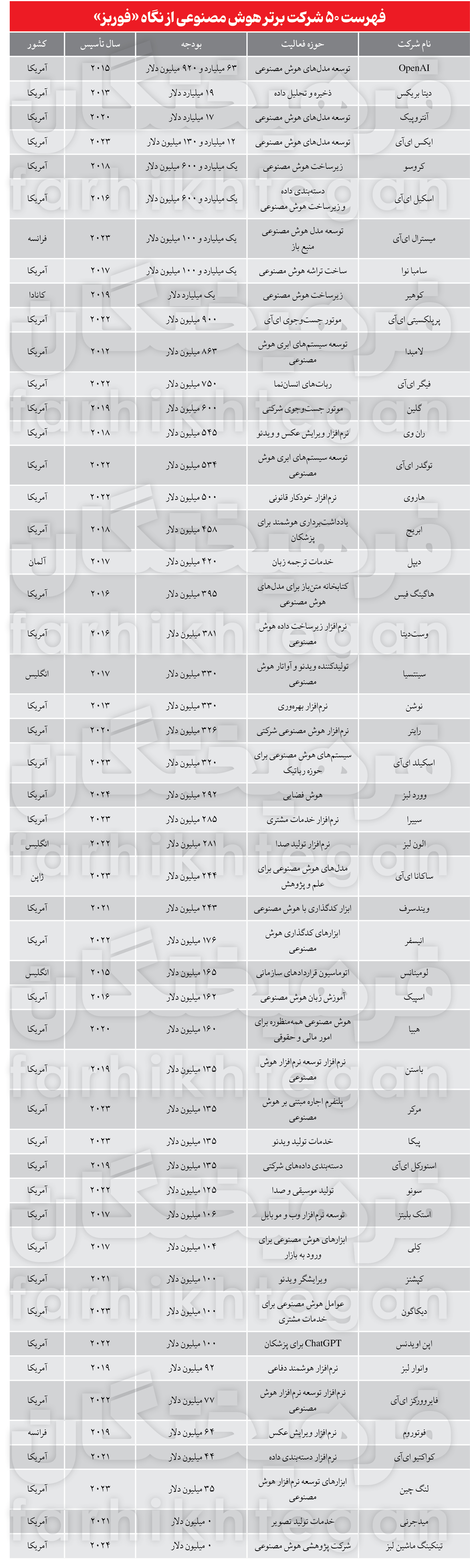 شرکتهای مدلسازی در حوزه هوش مصنوعی مانند OpenAI و «آنتروپیک» همچنان بزرگترین شرکتهای این فهرستند و مبالغ هنگفتی از سرمایهگذاران خطرپذیر سیلیکونولی را در شرکت خود جذب کردهاند. OpenAI که در سال 2015 افتتاح شد، قریب 63 میلیارد و 920 میلیون دلار روی توسعه هوش مصنوعی سرمایهگذاری کرده است. شرکت «آنتروپیک» هم سرمایهگذاری 17 میلیارددلاری را در این حوزه رقم زده است. درواقع، این دو غول هوش مصنوعی درمجموع حدود 81 میلیارد دلار سرمایهگذاری خطرپذیر جمعآوری کردهاند که بیش از نیمی از کل 142 میلیارد و 450 میلیوندلاری را به خود اختصاص میدهند که شرکتهای حاضر در این 50 شرکت برتر در سال جاری جذب کردهاند.