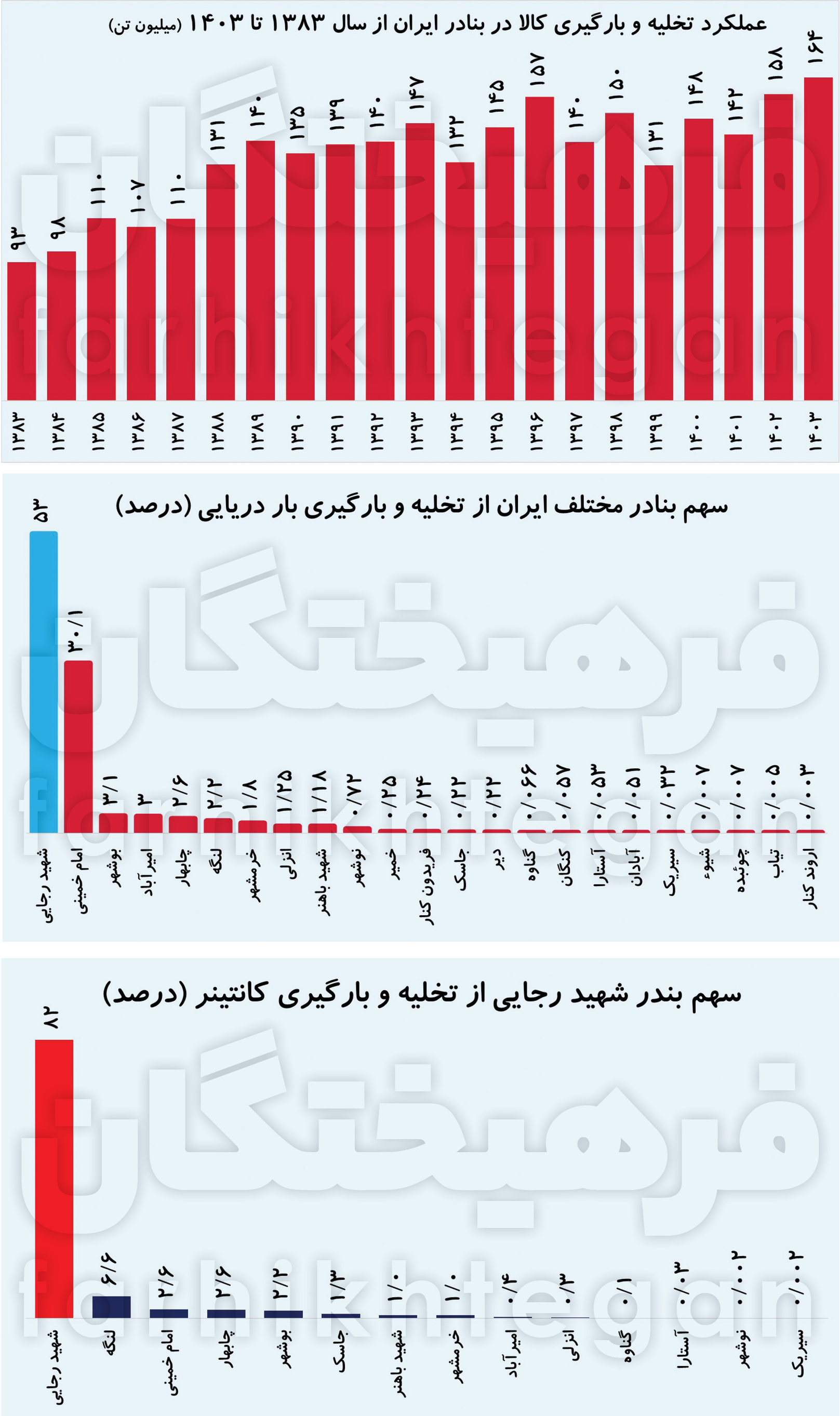 اما آمار دیگری نیز مربوط به تعداد تخلیه و بارگیری کانتینرهاست. براساس دادههای سازمان بنادر و دریانوردی کشور، در سال 1402 از 2 میلیون و 593 هزار تخلیه و بارگیری کانتینری در کشور، 82 درصد از آن مربوط به بندر شهید رجایی بوده است. بندر لنگه با 6.6 درصد، بندر امام خمینی و چابهار هر کدام با 2.6 درصد، بوشهر با 2.2 درصد و جاسک و بندر خرمشهر با 1.3 و 1 درصد در رتبههای بعدی قرار دارند.
