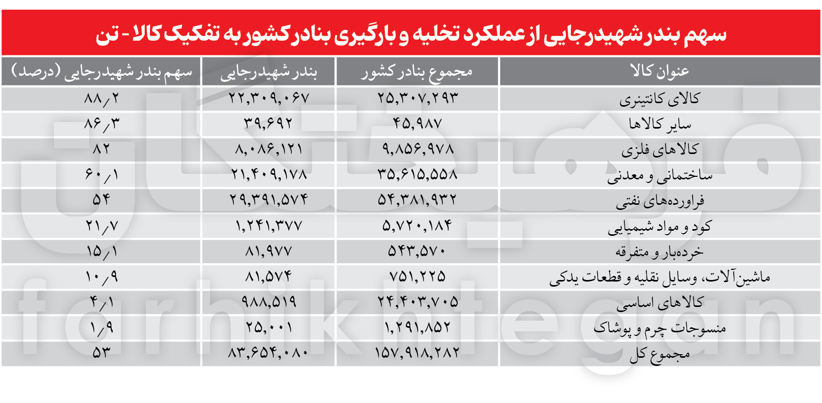 دادههای سازمان بنادر و دریانوردی کشور جزئیات مهمتری نیز دارد. یکی از این دادهها، مربوط به عناوین کالاهای جابهجاشده در بنادر است. براساس این دادهها، در سال 1402 از مجموع 158 میلیون تن کالای بارگیری و تخلیهشده در بنادر ایران، 53 درصد از آن مربوط به بندر شهید رجایی بوده است. طبق جدول این گزارش، سهم این بندر در کالاهای کانتینری کشور بیش از 88 درصد است. در کالاهای فلزی این مقدار 82 درصد، در بخش ساختمانی و معدنی بیش از 60 درصد، و در بخش فرآوردههای نفتی 54 درصد از کل واردات و صادرات فرآوردهها از این بندر انجام میشود. در بخش کود و مواد شیمیایی سهم بندر شهید رجایی نزدیک به 22 درصد، در بخش خرده بار و متفرقه 15 درصد و در سایر بخشها همچون ماشینآلات، وسایل نقلیه و قطعات یدکی، کالاهای اساسی و منسوجات چرم و پوشاک این مقدار زیر 10 درصد است.